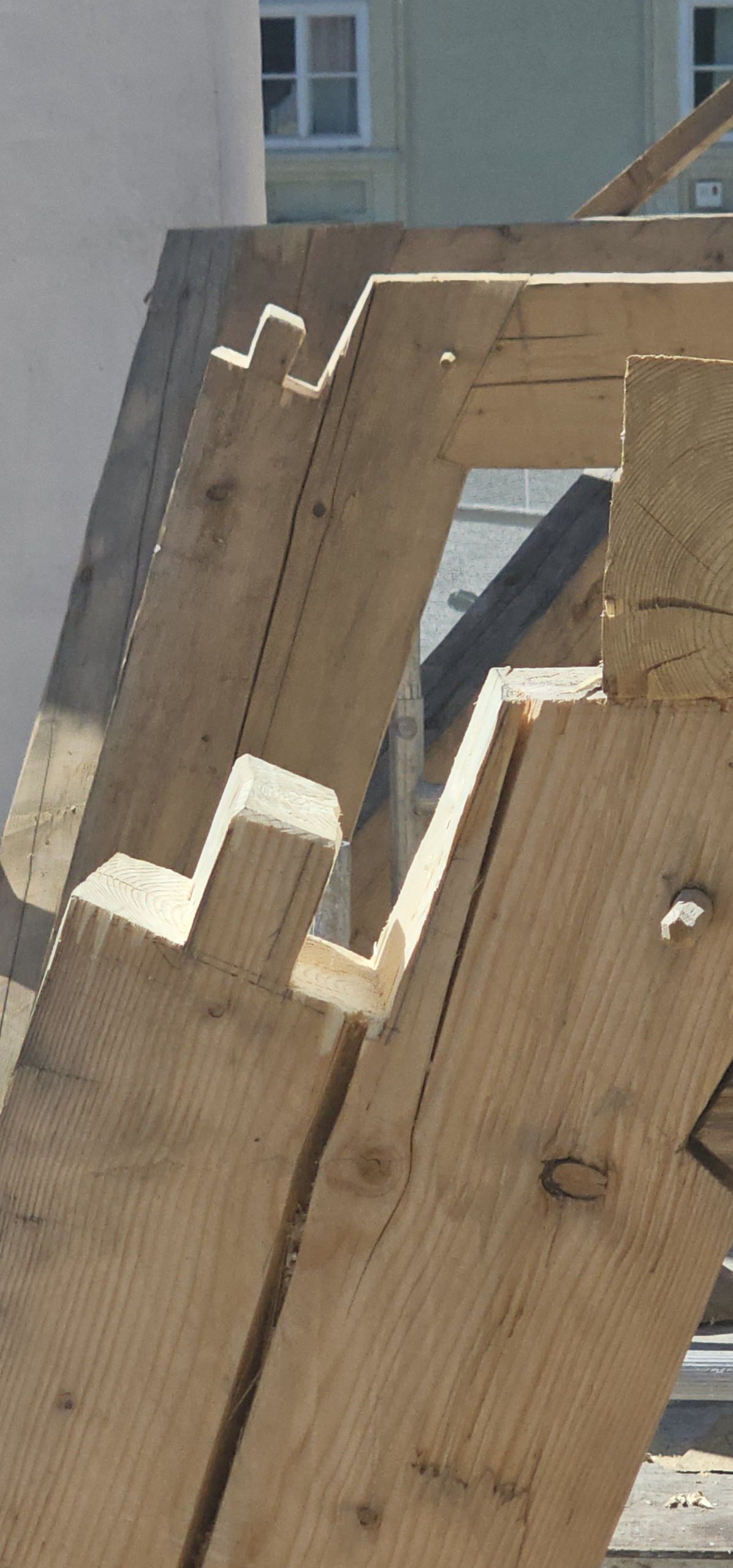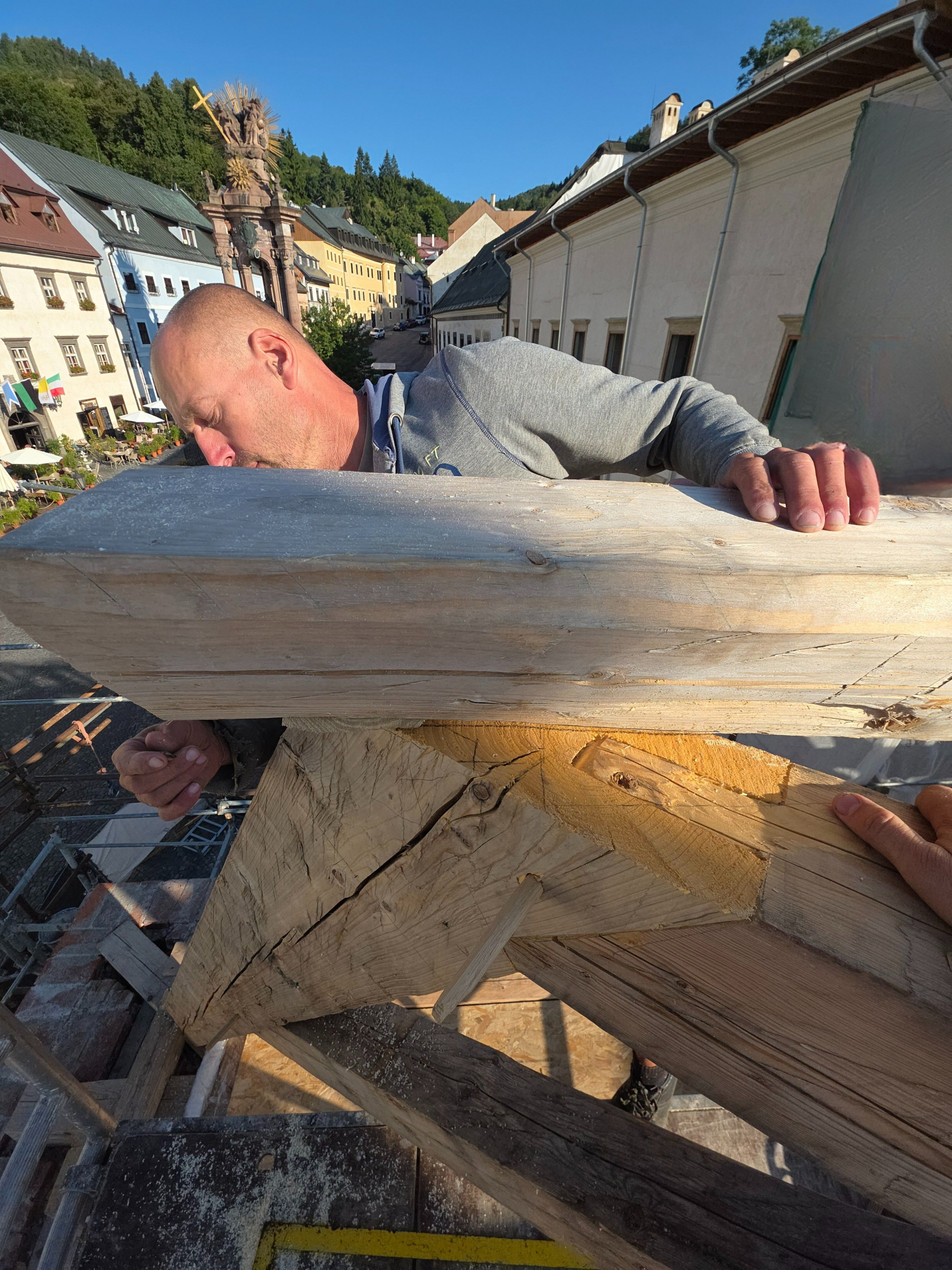 Pri výrobe tradičných tesárskych spojov rozhoduje presnosť a sústredenie. Každý spoj musí byť navrhnutý priamo na mieste a prispôsobený konkrétnej časti krovu. Strecha Szitnyayovského domu má nepravidelný tvar, preto tu neexistuje „univerzálne riešenie“ – každý detail je originál.