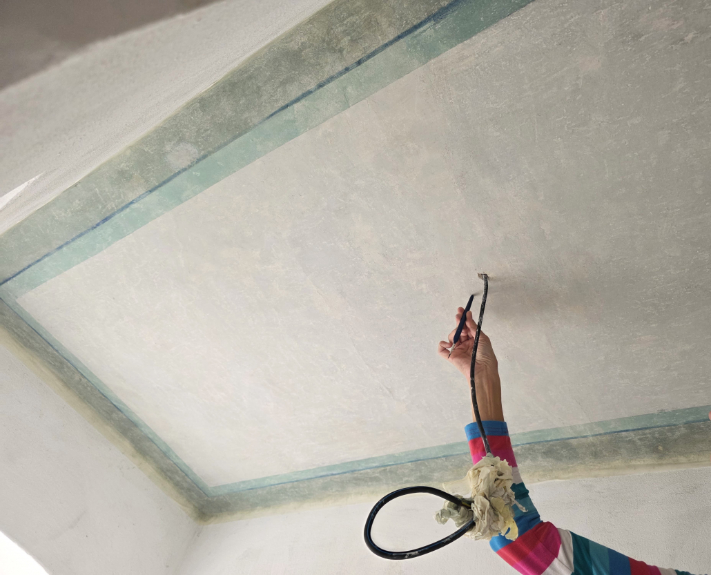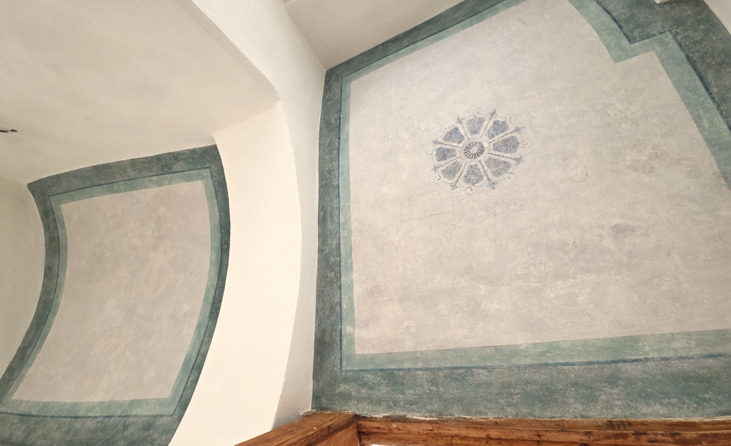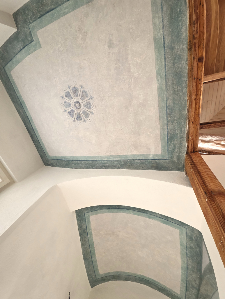 Na základe vyhodnotenia výsledkov prieskumu a analýz padlo rozhodnutie pristúpiť k obnove maľby. Procesy dostali rýchly, no premyslený spád. Pôvodnú geometrickú výmaľbu v príjemných farebných tónoch sme citlivo dočistili, stabilizovali a chýbajúce časti doplnili retušou tak, aby výsledok pôsobil prirodzene, nenásilne a vizuálne jednotne.