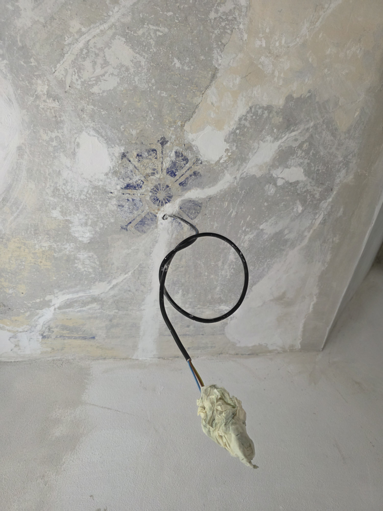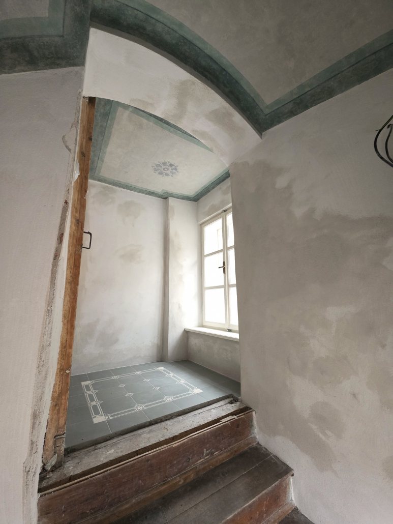 Počas obnovy interiérov banskoštiavnického historického meštianskeho domu sme na strope schodiska objavili fragmenty pôvodnej maliarskej výzdoby. Tento nenápadný, no o to vzácnejší nález priniesol veľké nadšenie celému realizačnému tímu – a čo je najdôležitejšie, úprimnú radosť majiteľom objektu. Objav nám umožnil nahliadnuť do staršej architektonicko – výtvarnej koncepcie výrazu priestoru a stal sa impulzom pre jeho opätovné znovuoživenie.
