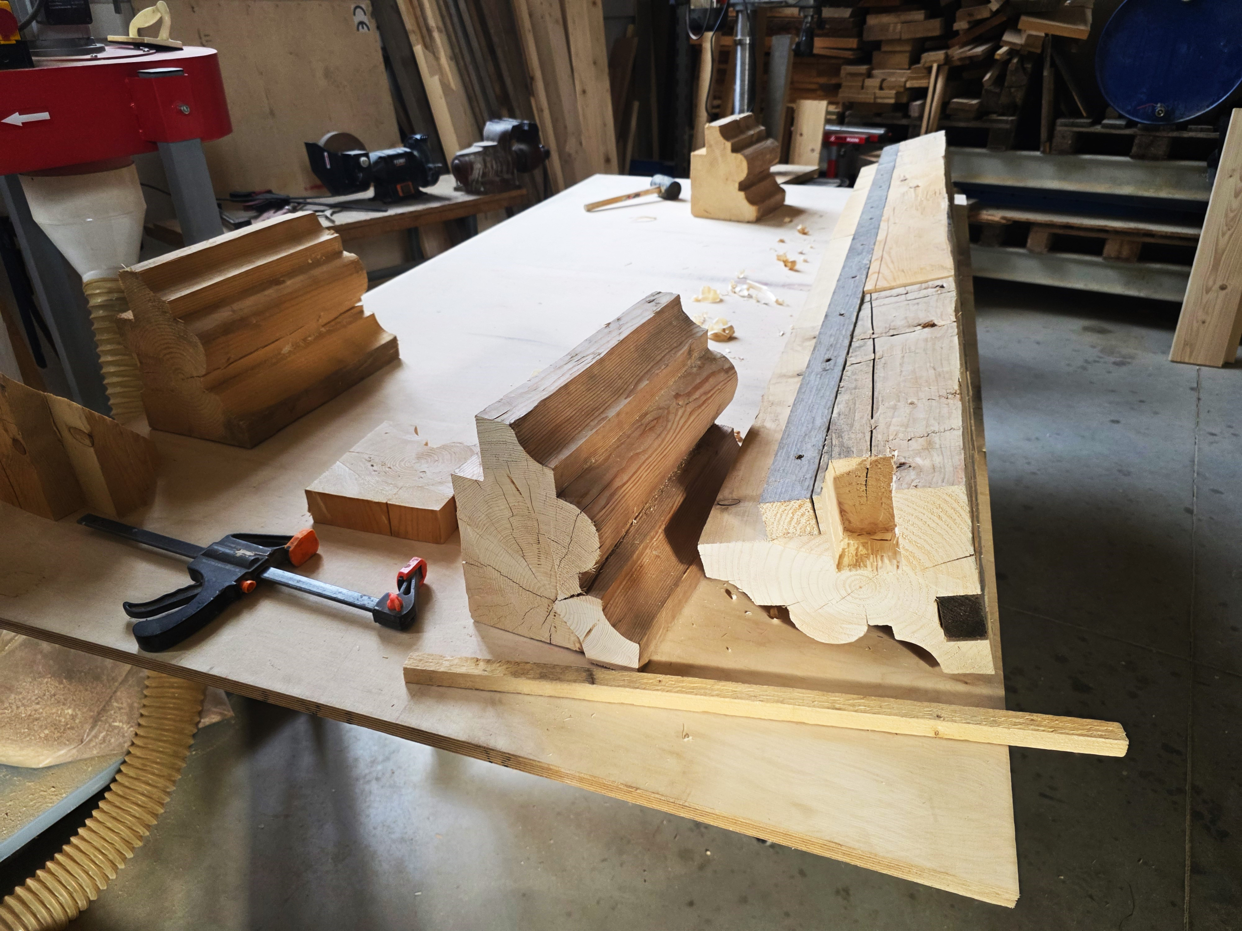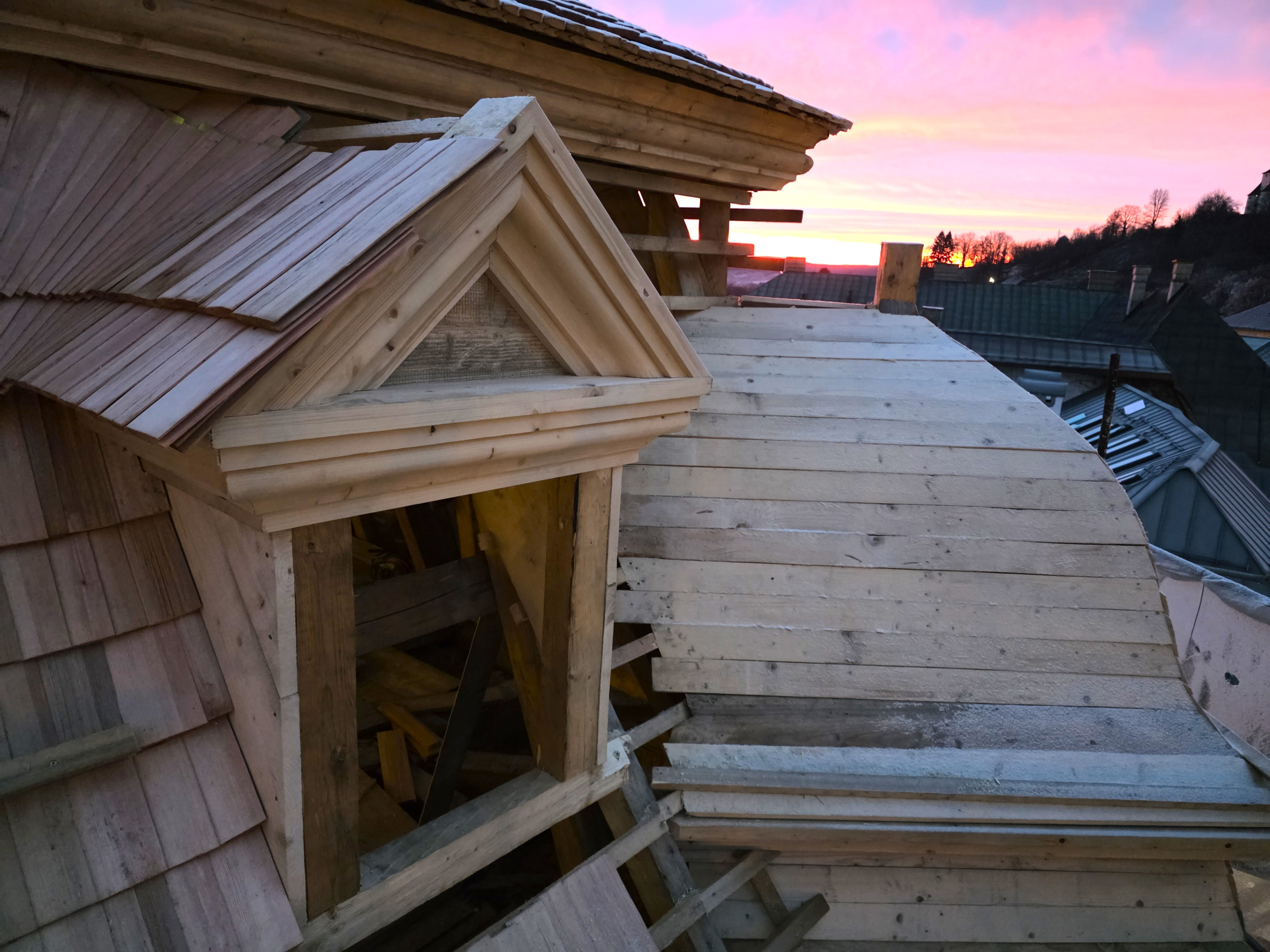Pri pohľade na zrekonštruovanú manzardovú strechu Szitnyayovského domu si určite všimnete výrazný drevený profilovaný prvok, ktorý ju horizontálne delí. Ide o tzv. kordónovú (pásovú) rímsu krovu.
