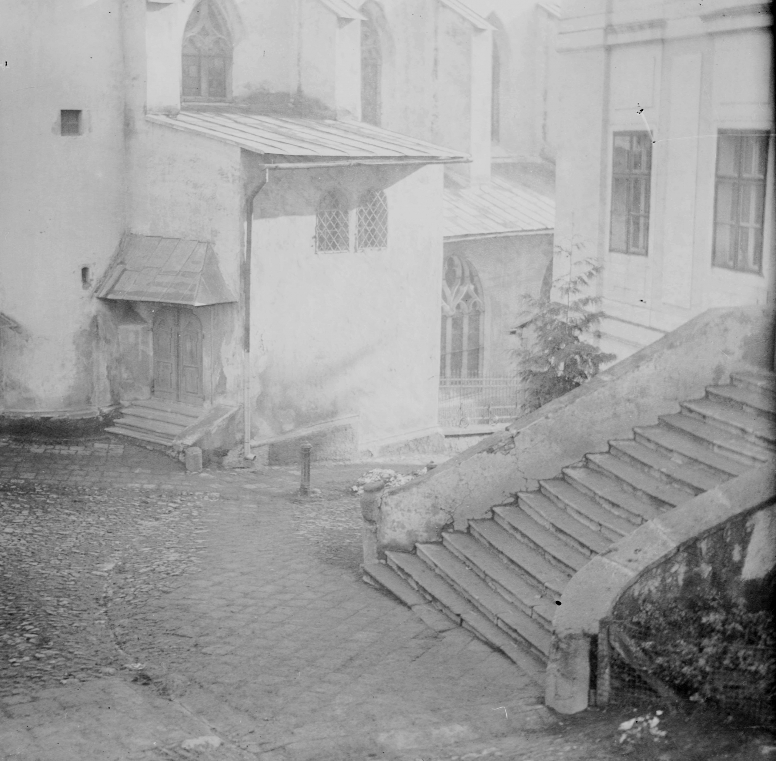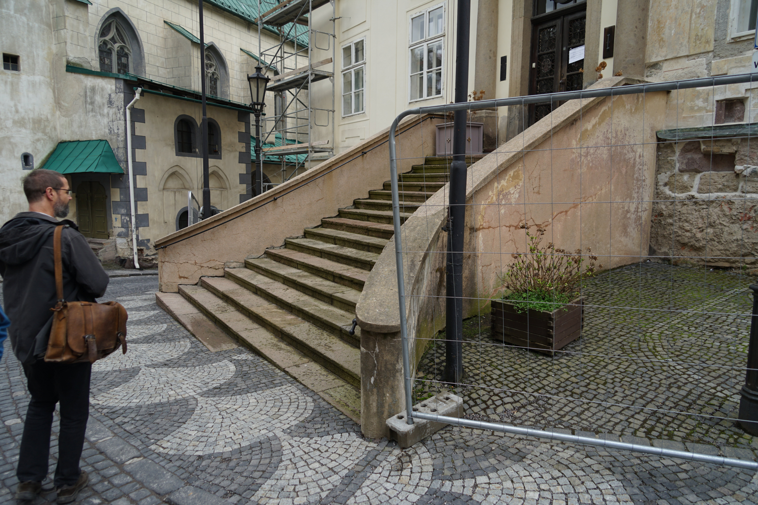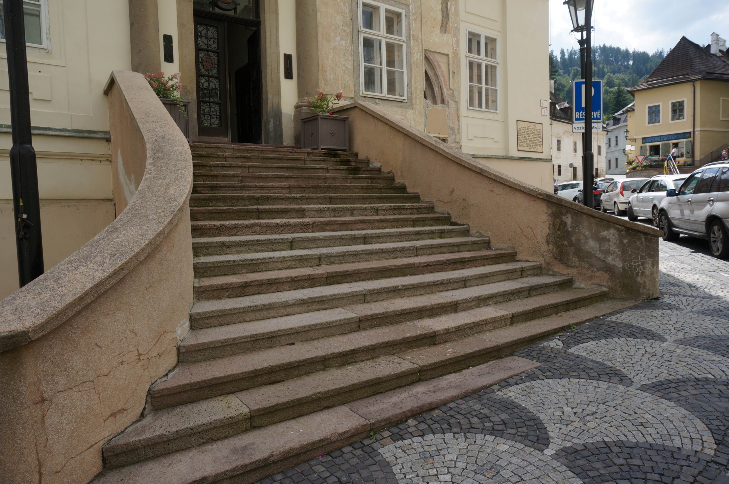 Analýzu historickej fotodokumentácie sme nevynechali ani pri návrhu obnovy hlavného exteriérového vstupného schodiska do budovy banskoštiavnickej radnice. Už na staršej fotografii z roku 1916 či známej fotoreportáži z návštevy prezidenta T. G. Masaryka z 25. augusta 1923 je zrejmé, že vstupné schodisko bolo v narušenom stavebno-technickom stave. Vlhkosť a zasolenie poškodili nielen omietané povrchy elegantne tvarovaného murovaného zábradlia, ale závažne narušili aj kamenné murivá obvodových stien schodiska.