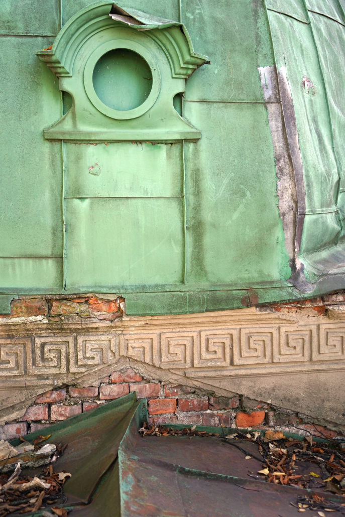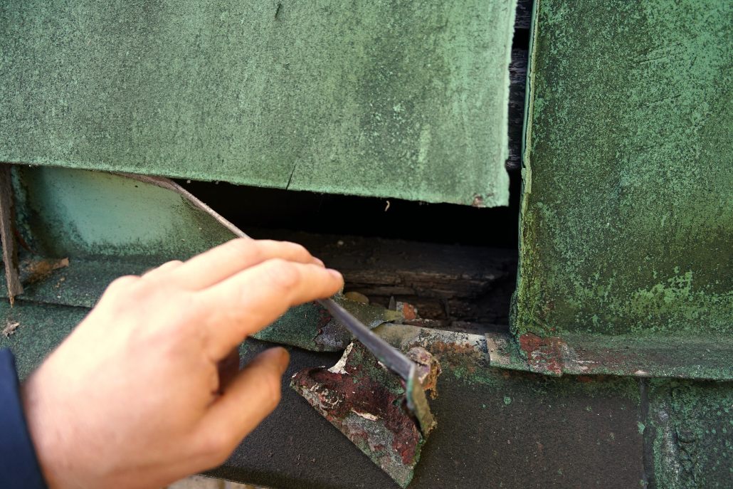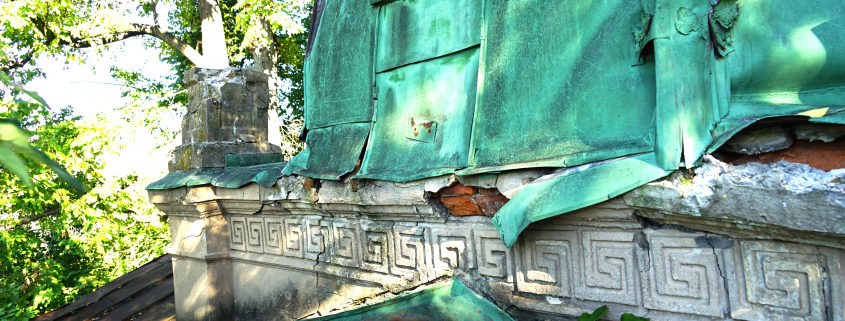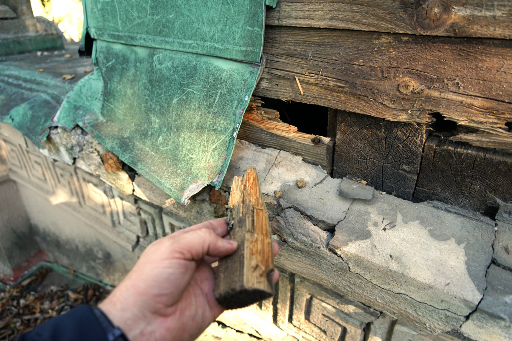 Najzásadnejší problém predstavuje medená strešná krytina. Trhliny, deformácie spojov a miesta dlhodobého zatekania spôsobili degradáciu drevených prvkov krovu aj podbitia. Voda pritom nepoškodzuje iba drevo – postupne zasiahla aj murované a omietané časti hrobky.