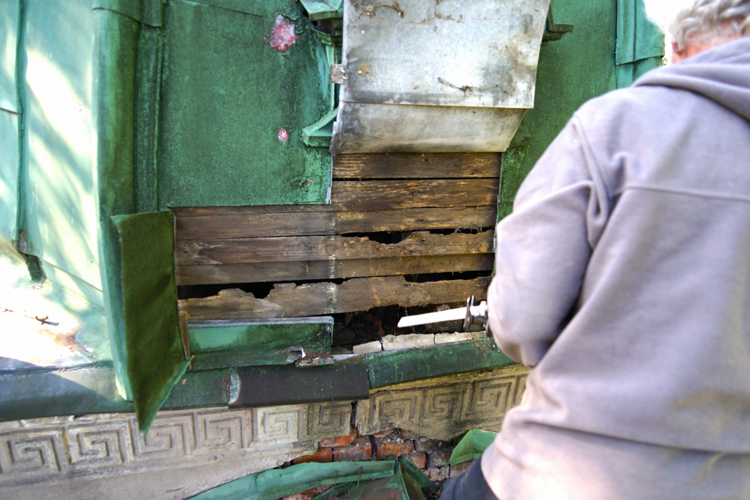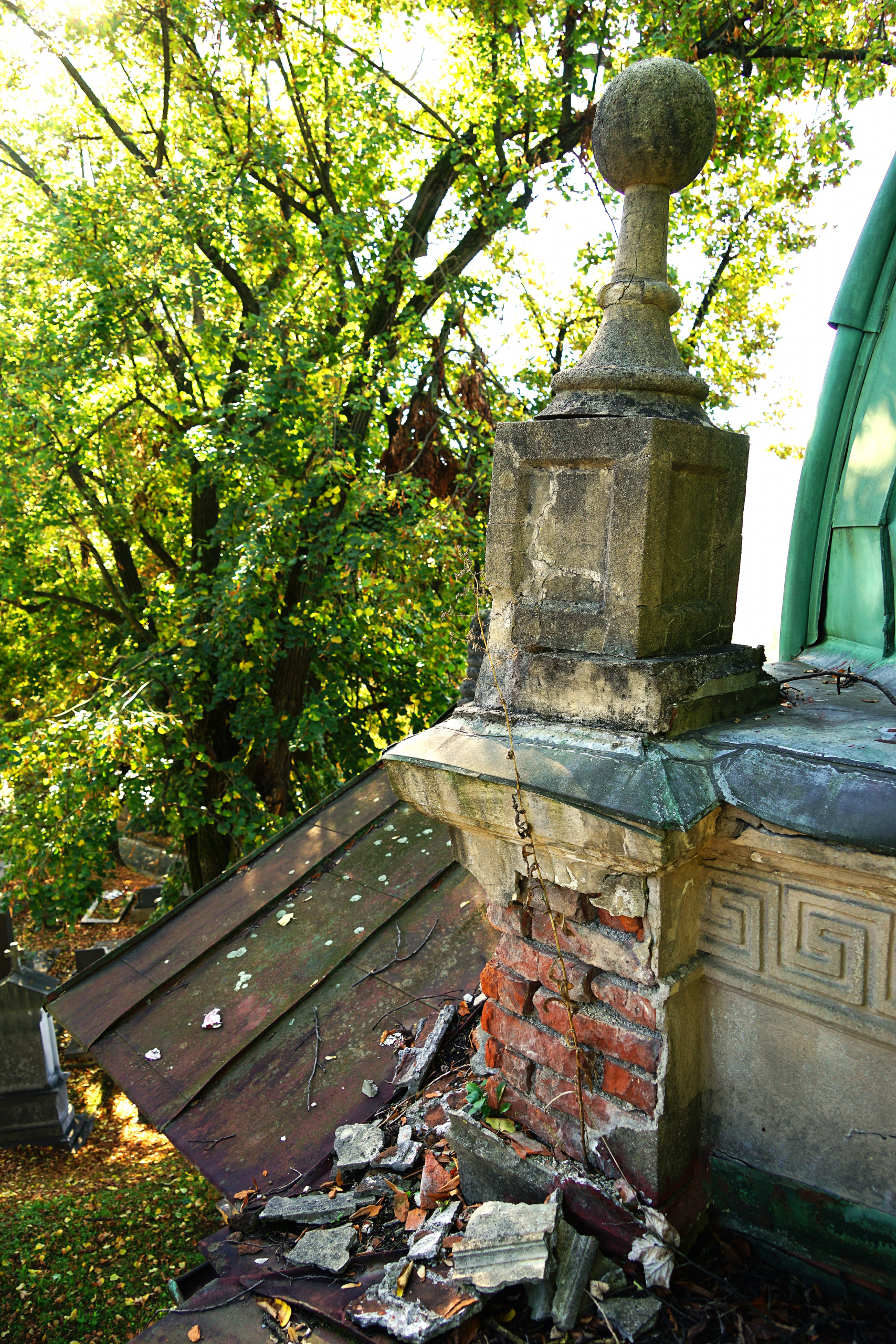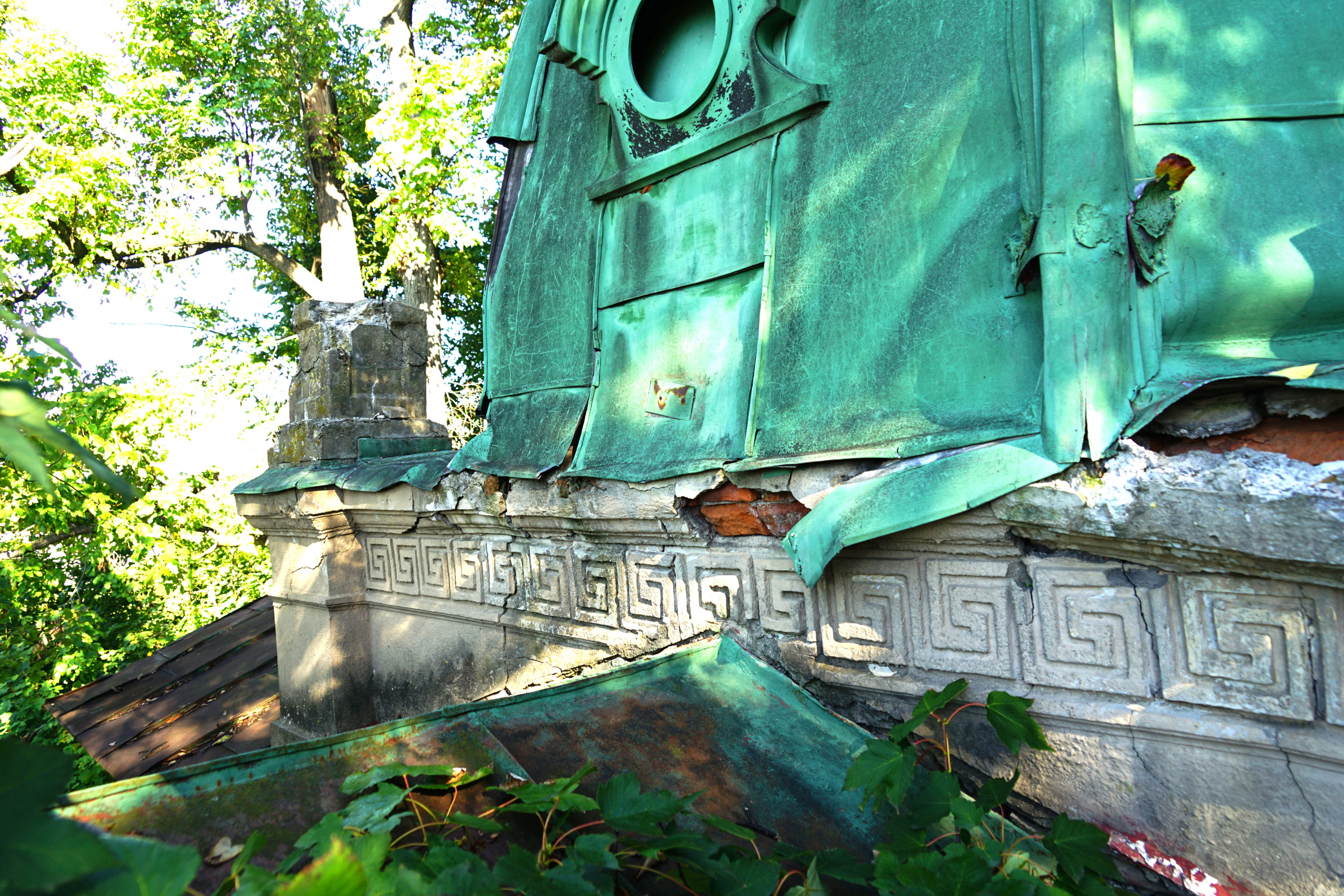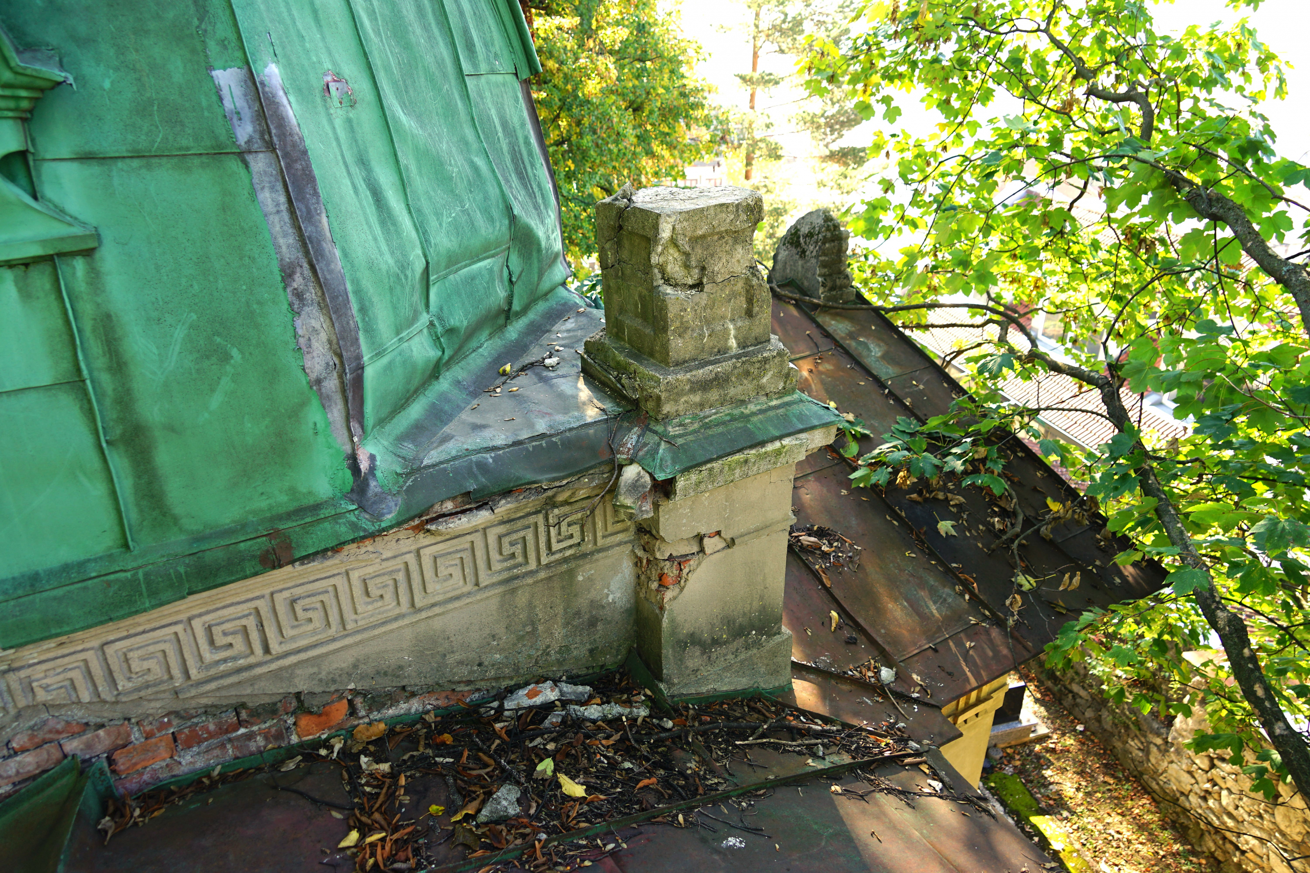 Najzásadnejší problém predstavuje medená strešná krytina. Trhliny, deformácie spojov a miesta dlhodobého zatekania spôsobili degradáciu drevených prvkov krovu aj podbitia. Voda pritom nepoškodzuje iba drevo – postupne zasiahla aj murované a omietané časti hrobky.