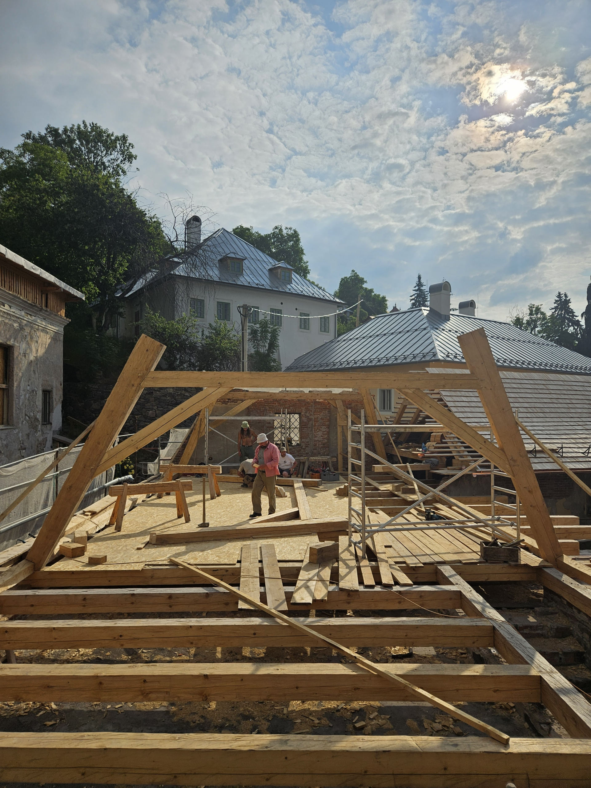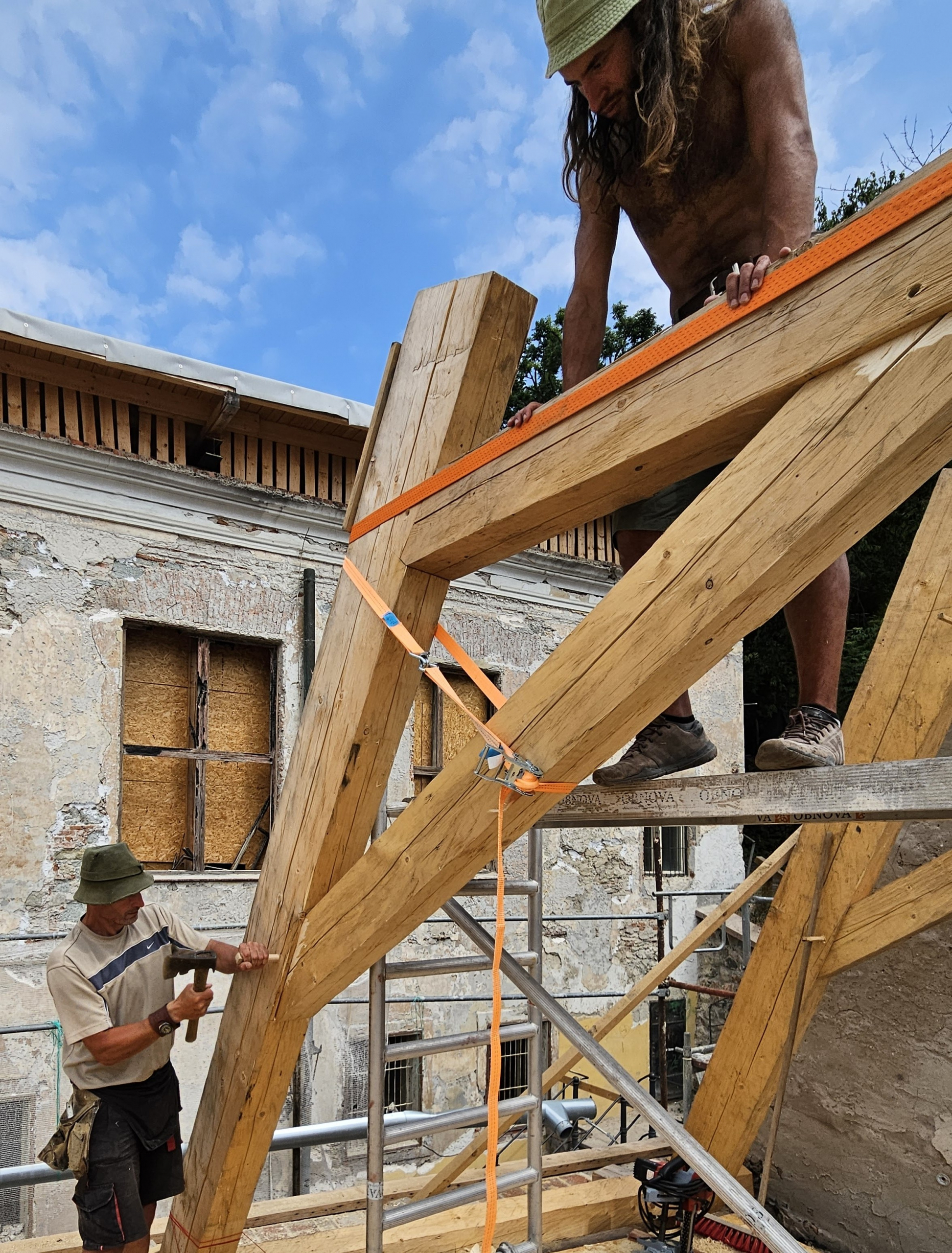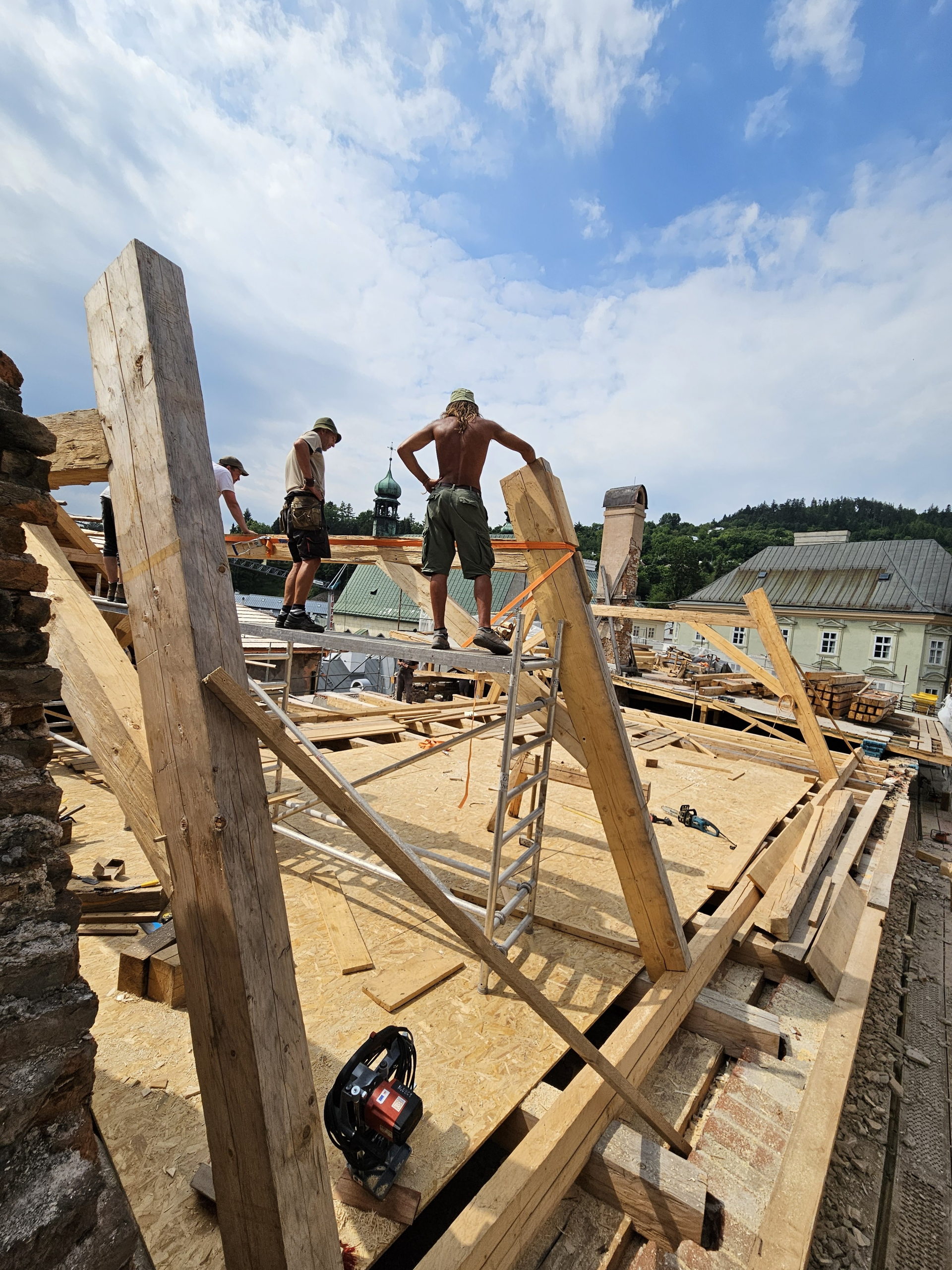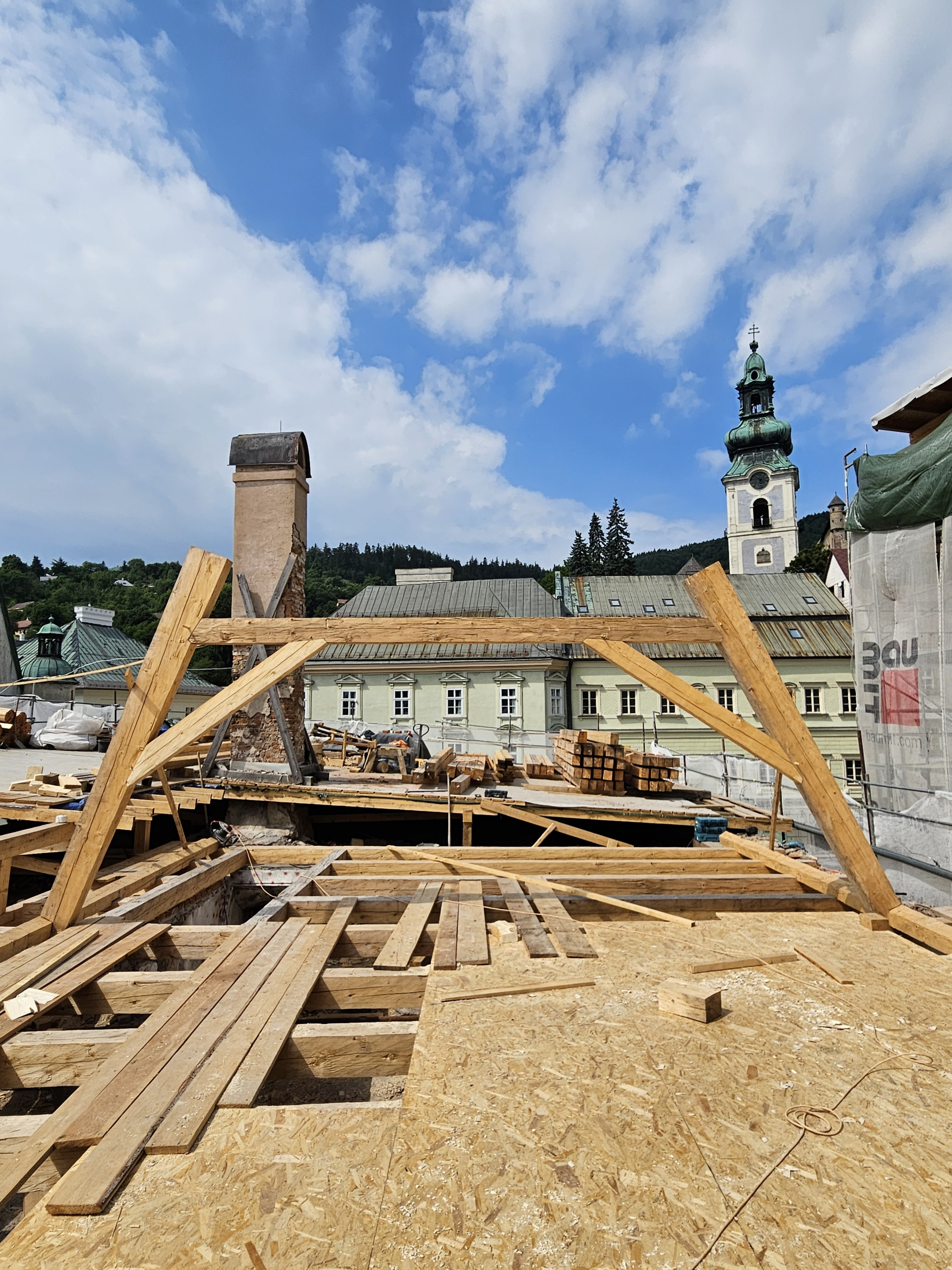 Počas aktuálnych slnečných dní stúpa na streche Szitnyayovského domu nielen teplota, ale aj TESÁRSKY ADRENALÍN! Na severnom krídle sa už postupne dvíhajú spodné rámy ručne kresaného manzardového krovu.