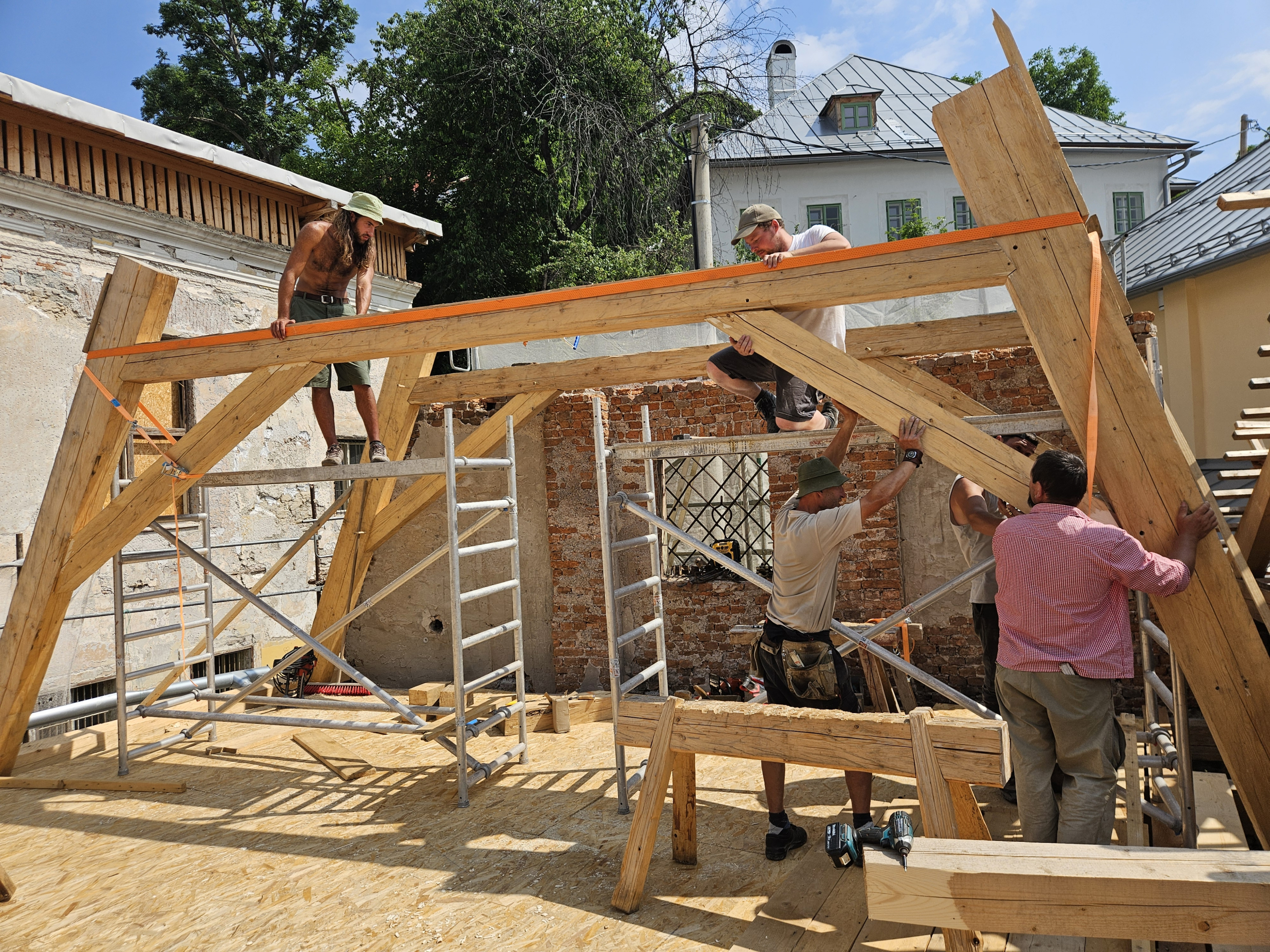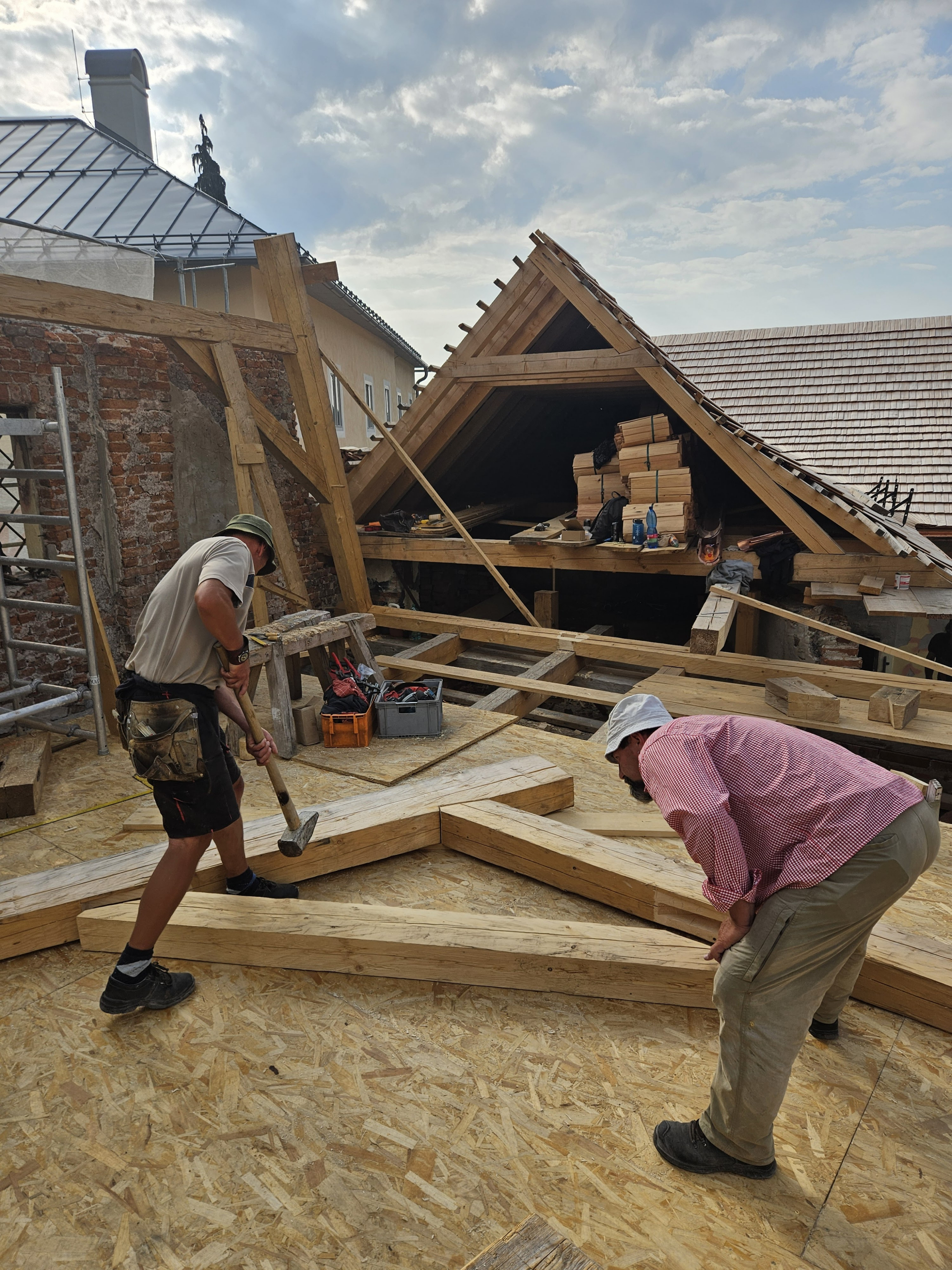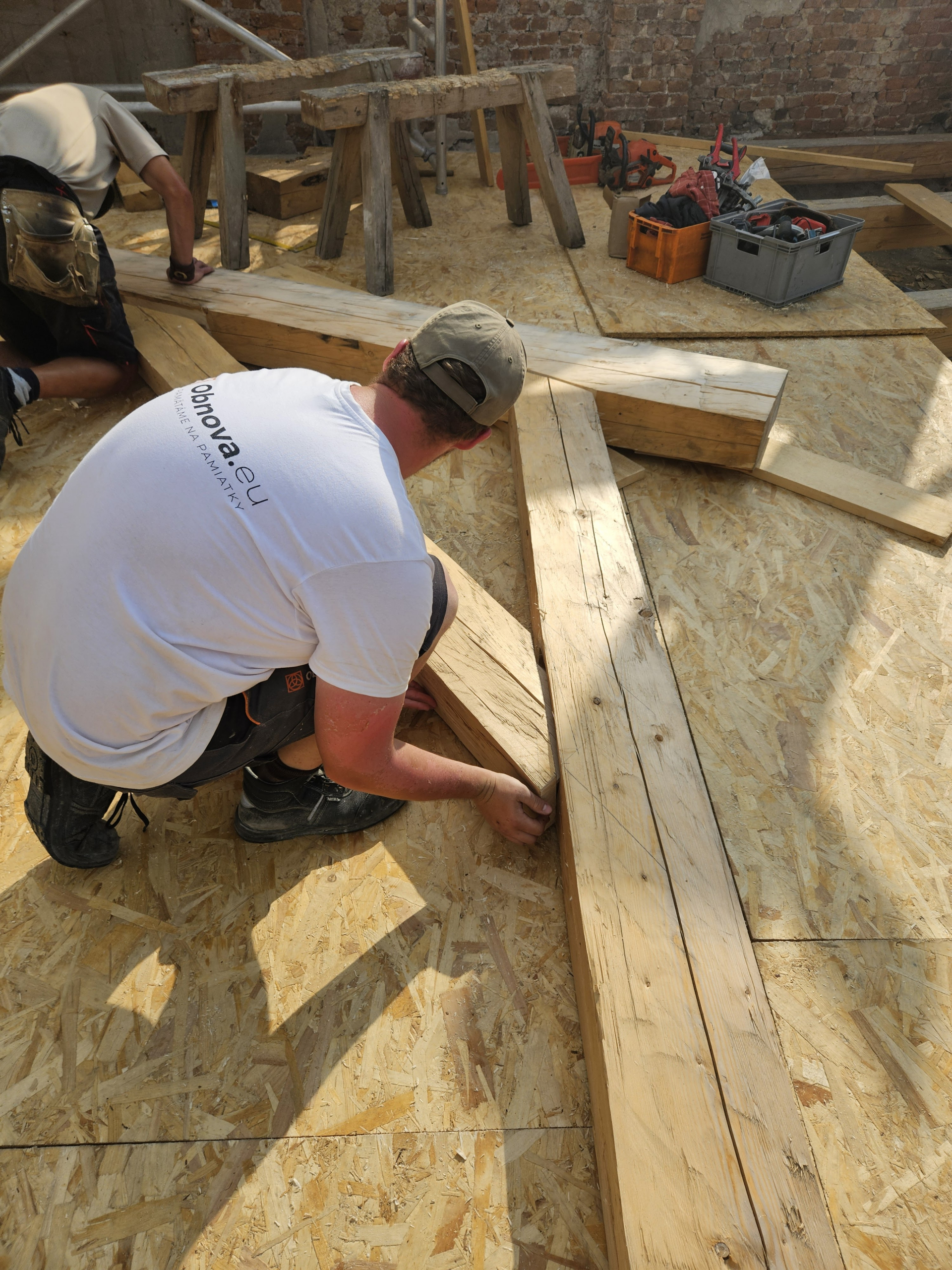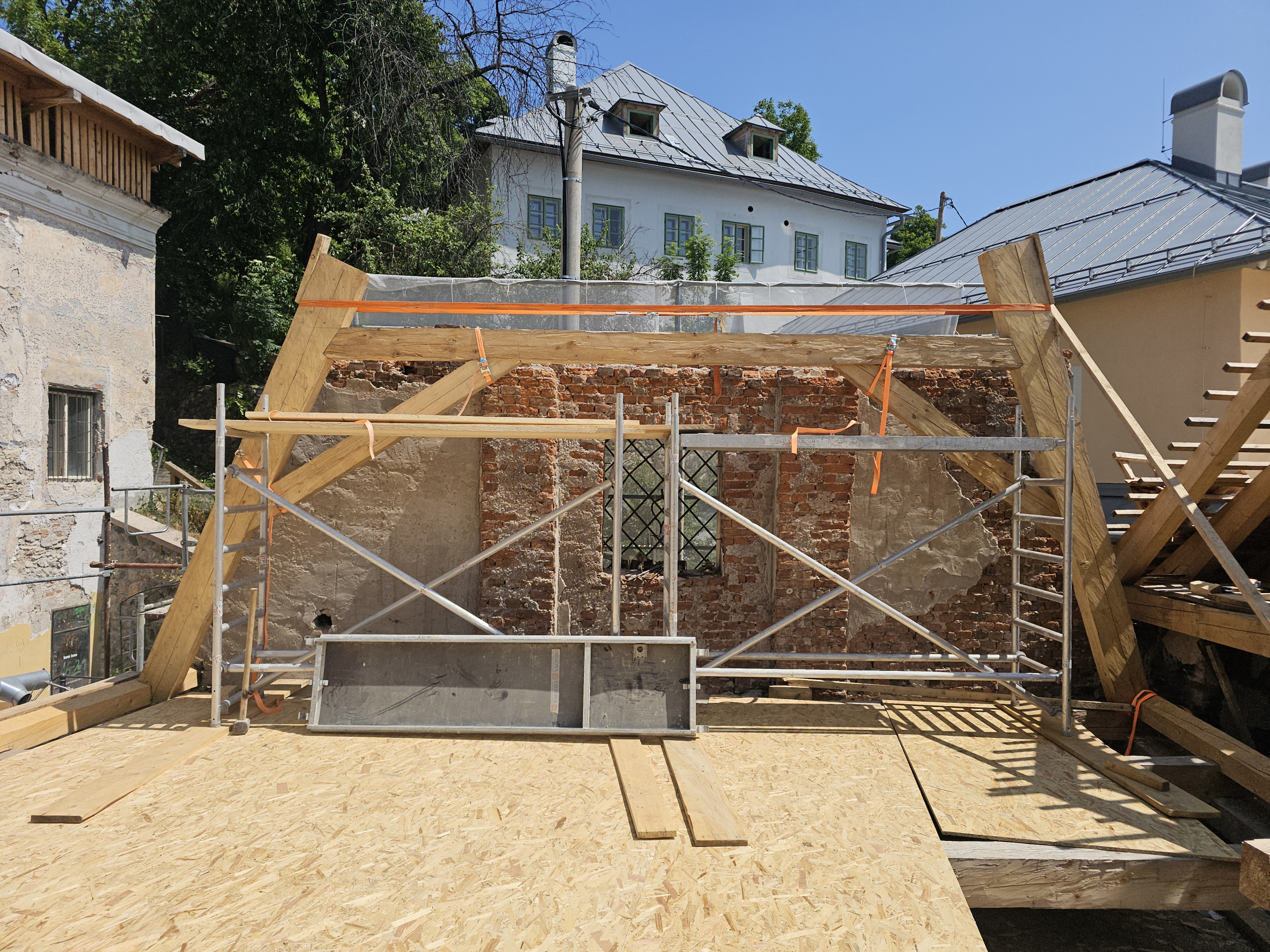 Počas aktuálnych slnečných dní stúpa na streche Szitnyayovského domu nielen teplota, ale aj TESÁRSKY ADRENALÍN! Na severnom krídle sa už postupne dvíhajú spodné rámy ručne kresaného manzardového krovu.