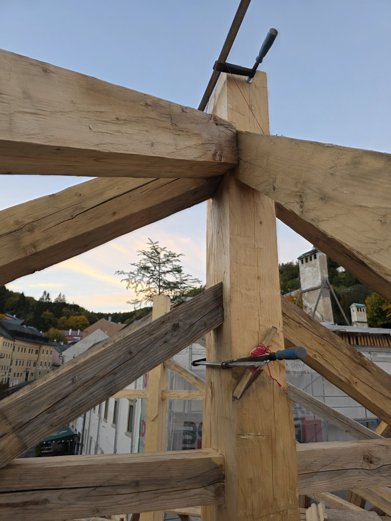 Umiestnenie Glajchy na kópiu barokového krovu symbolicky potvrdzuje, že náš tesársky tím zložil remeselnú skúšku a precízne zrekonštruoval drevenú konštrukciu.