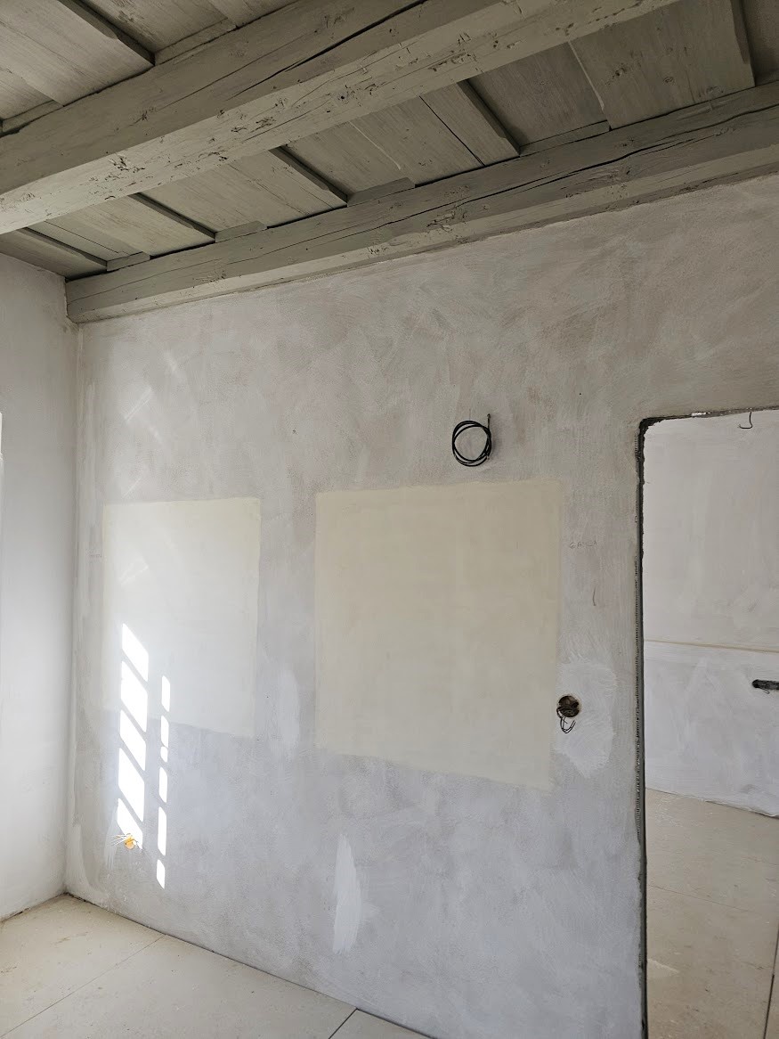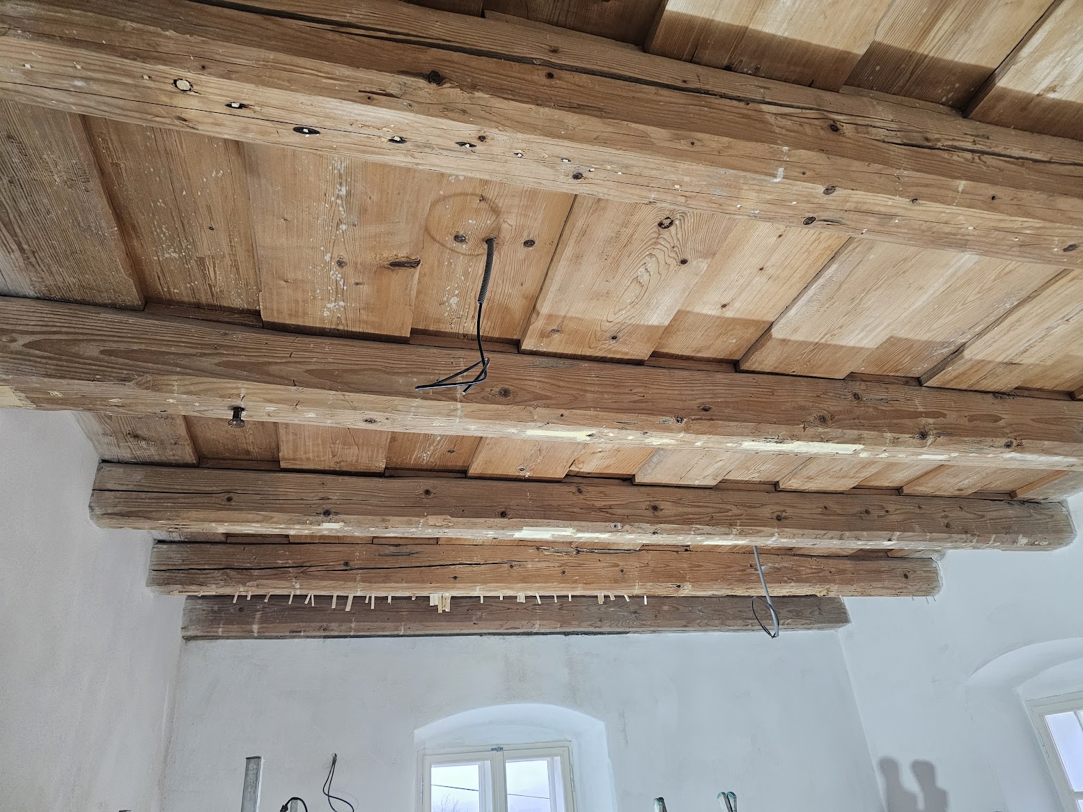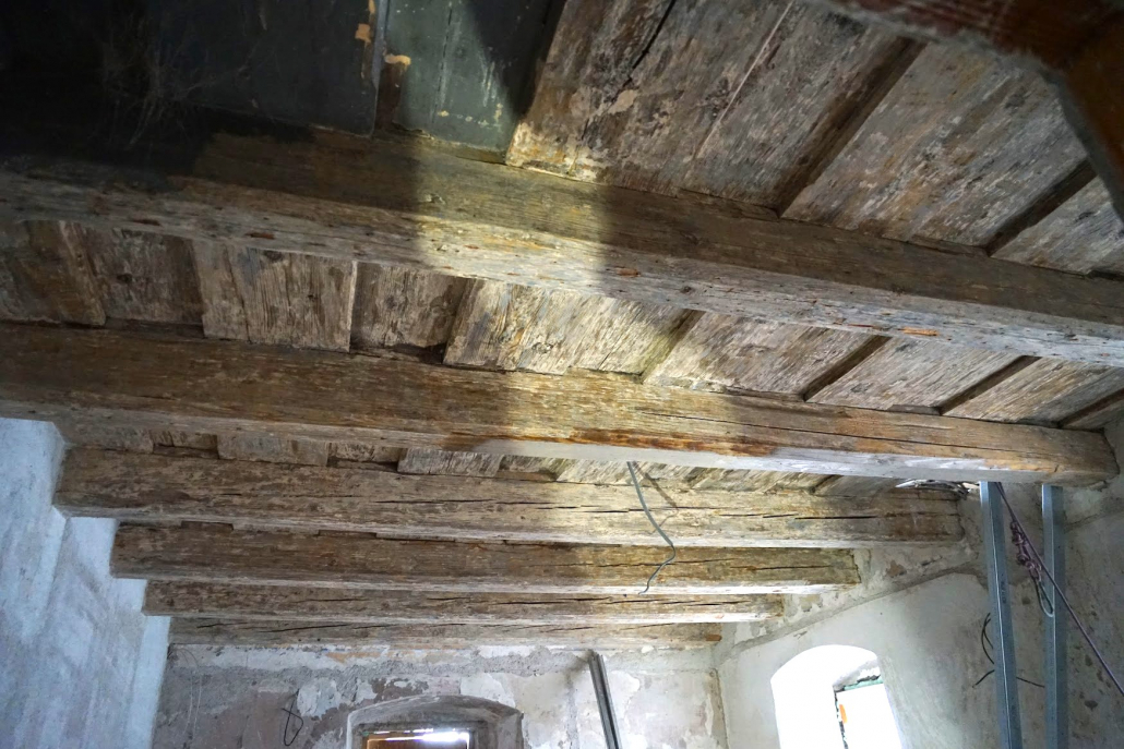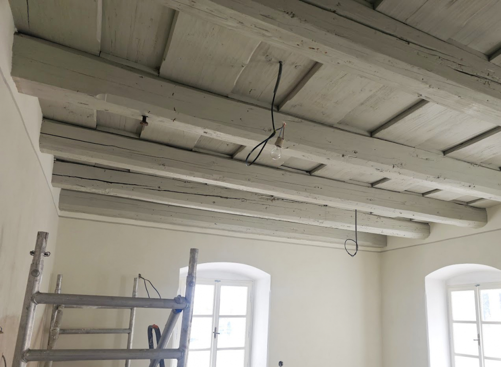 Záverečná etapa patrila povrchovej úprave, ktorá mala za cieľ drevo nielen chrániť, ale aj esteticky sceliť. Po konsolidácii a jemnom prebrúsení sme na stropy naniesli krycí ľanový náter v príjemnom pastelovom tóne. Voľba tohto materiálu nebola náhodná – ľanové oleje sú s historickými konštrukciami plne kompatibilné, nechávajú drevo „dýchať“ a časom získavajú ušľachtilý vzhľad.