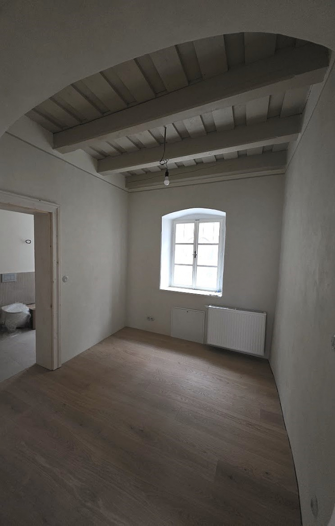 Zvolený odtieň plynule nadväzuje na celkovú farebnú koncepciu interiéru a prepája historické prvky s modernými nárokmi na bývanie. Vďaka precíznej obnove sa z pôvodne nenápadných, či dokonca zakrytých konštrukcií, stali kľúčové vizuálne prvky interiéru tohto historického domu.