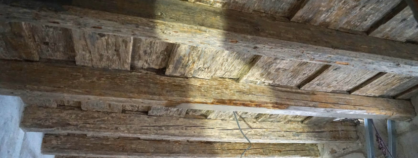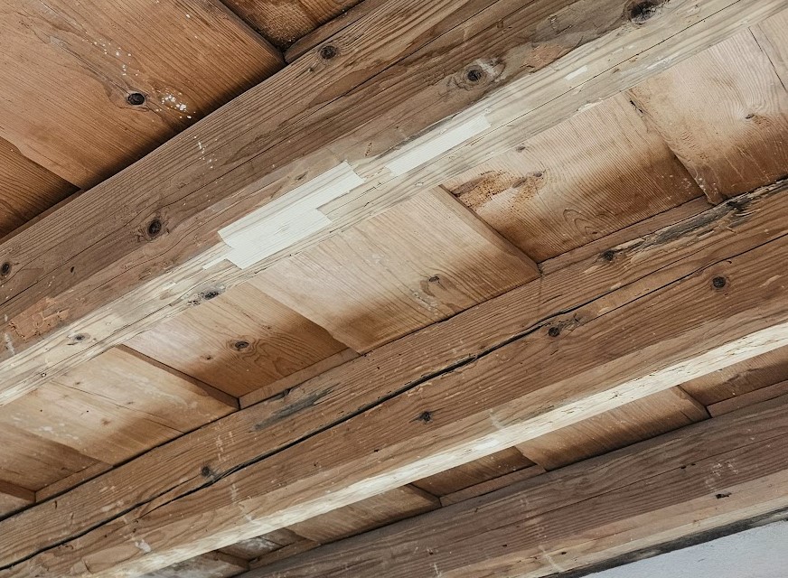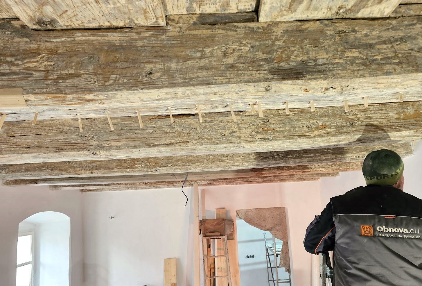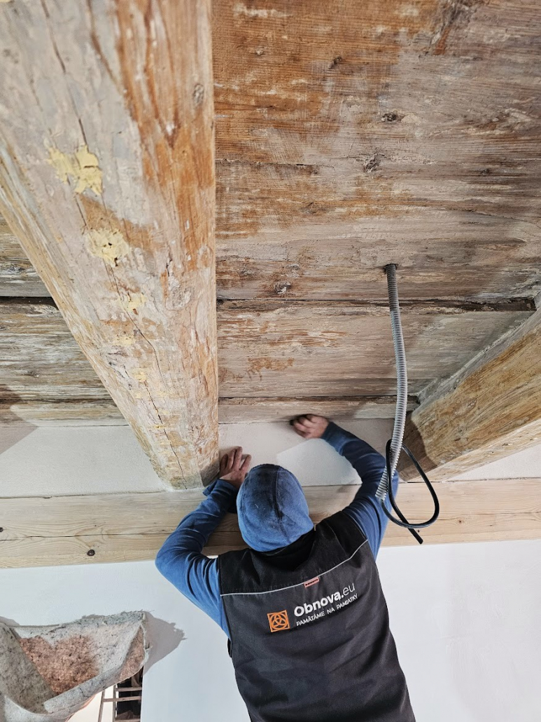 Prvým a kľúčovým krokom bola podrobná diagnostika. Sledovali sme nielen mieru biologického napadnutia, ale aj zvyškovú vlhkosť a integritu spojov. Diagnostika našťastie neidentifikovala závažné statické poruchy nosných trámov ani záklopov. Vďaka tomu sme sa mohli vyhnúť rozsiahlym statickým intervenciám či výmenám celých prvkov a sústrediť sa na konzerváciu pôvodnej substancie.