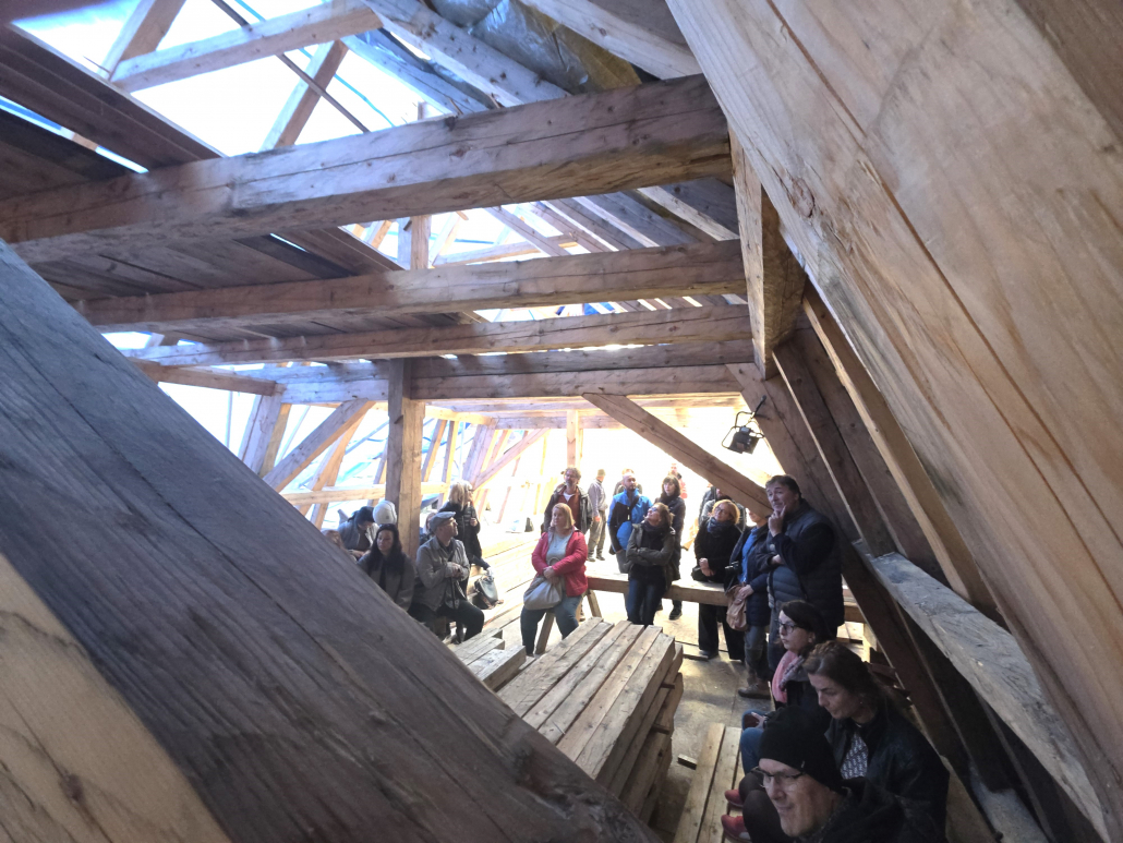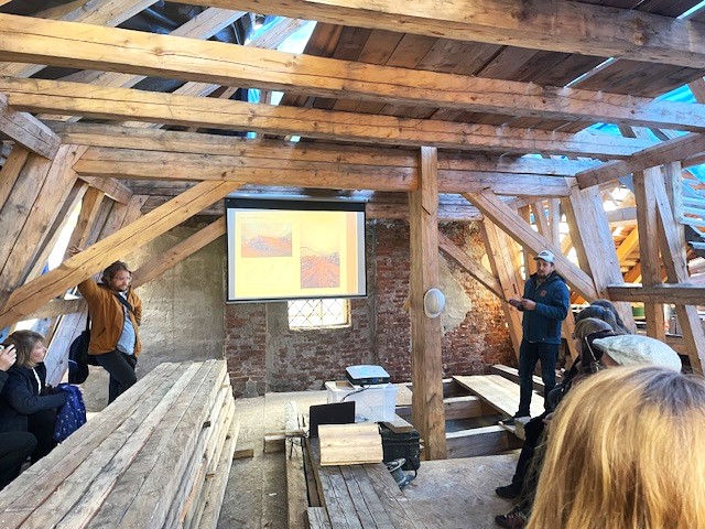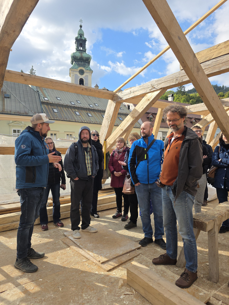 Účastníci absolvovali aj komentovanú exkurziu do dvoch výnimočných objektov: do krovu klasicistickej radnice, kde sa predstavili rôzne modely opráv s minimálnym zásahom do pôvodnej substancie, a na strechu Szitnyayovského domu, kde práve prebieha viazanie nového – ručne kresaného – krovu.