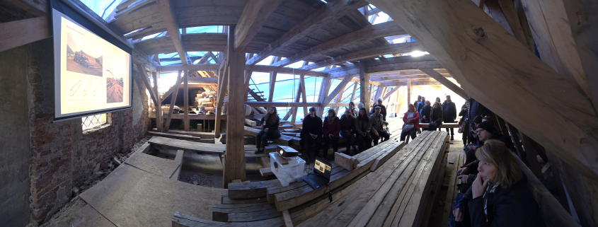 Účastníci absolvovali aj komentovanú exkurziu do dvoch výnimočných objektov: do krovu klasicistickej radnice, kde sa predstavili rôzne modely opráv s minimálnym zásahom do pôvodnej substancie, a na strechu Szitnyayovského domu, kde práve prebieha viazanie nového – ručne kresaného – krovu.
