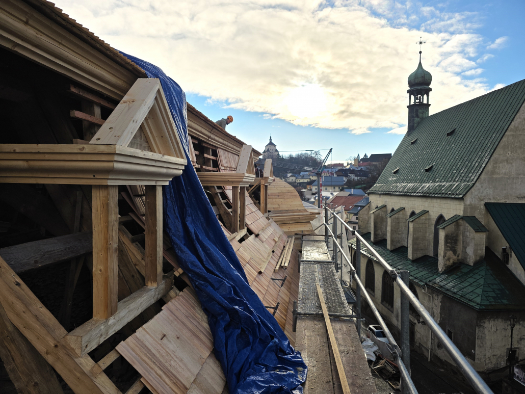Aktuálna fotodokumentácia zachytáva dynamiku záverečných prác rekonštrukcie strechy. Pokládka štiepaného šindľa vrcholí a na povrch vystupuje precízna remeselná práca, ktorá sa bežne skrýva pod vrstvami finálneho výsledku. Vďaka fotografiám môžete aj vy nahliadnuť do živého procesu.