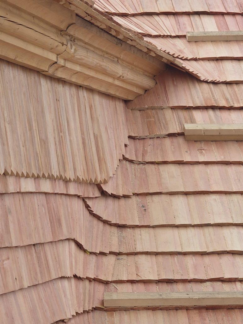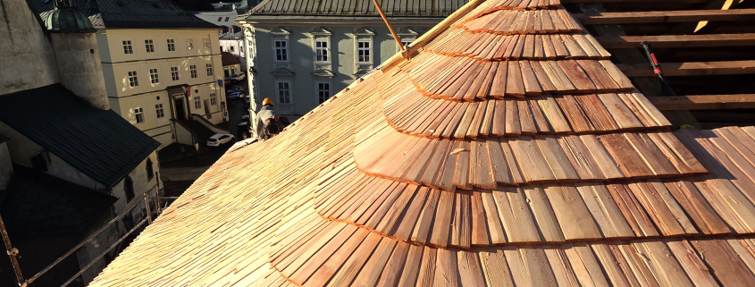 V úzkej spolupráci s projektantmi a koordinačným tímom remeselníci starostlivo cizelujú všetky rozhodujúce prvky strechy – vikiere, úžľabia, nárožia, hrebene, rímsy aj samotné riadkovanie štiepaného šindľa. Každý krok musí fungovať technicky a zároveň pôsobiť harmonicky. Práve tento súlad určuje skutočnú kvalitu obnovy historickej architektúry.