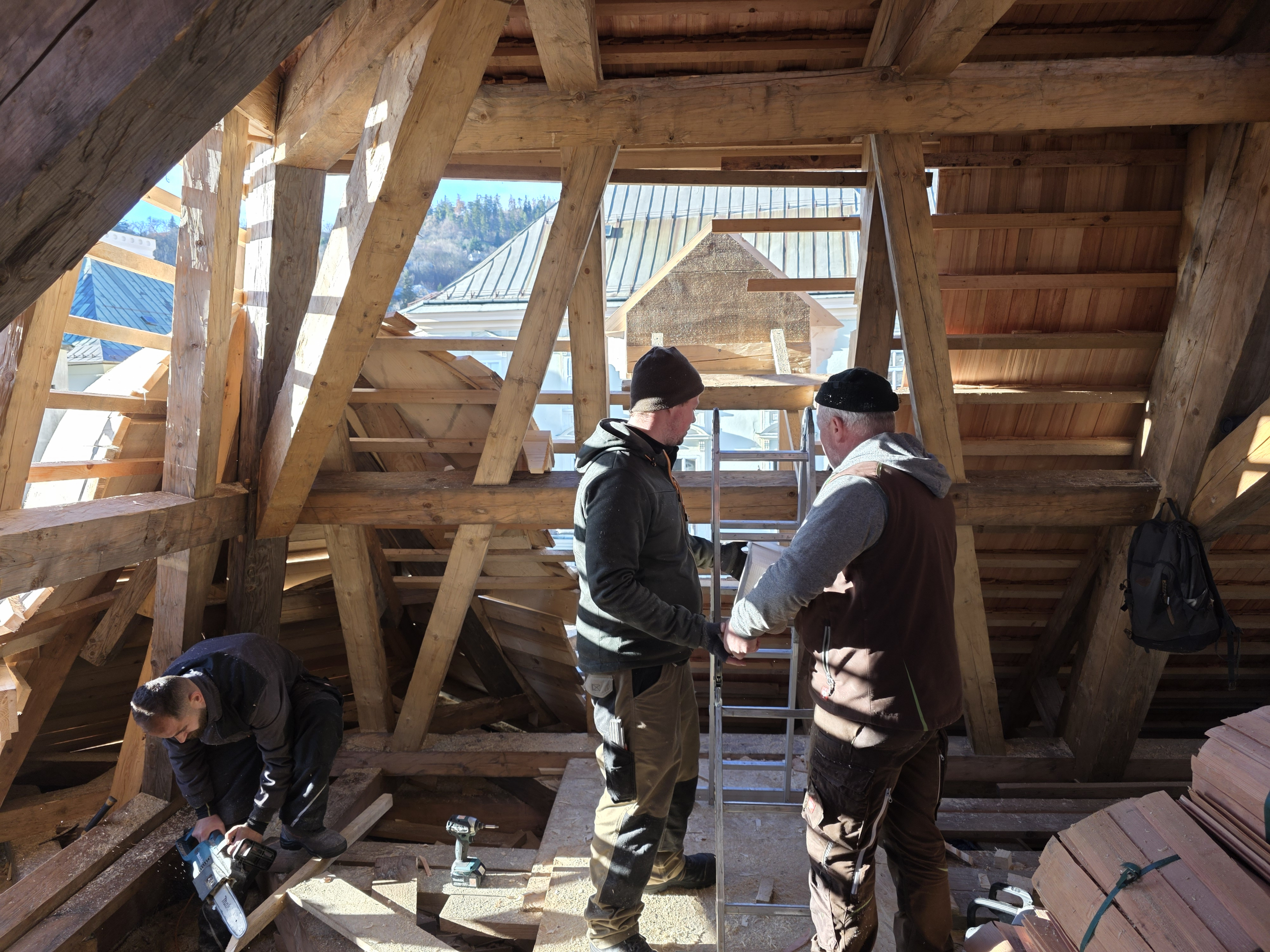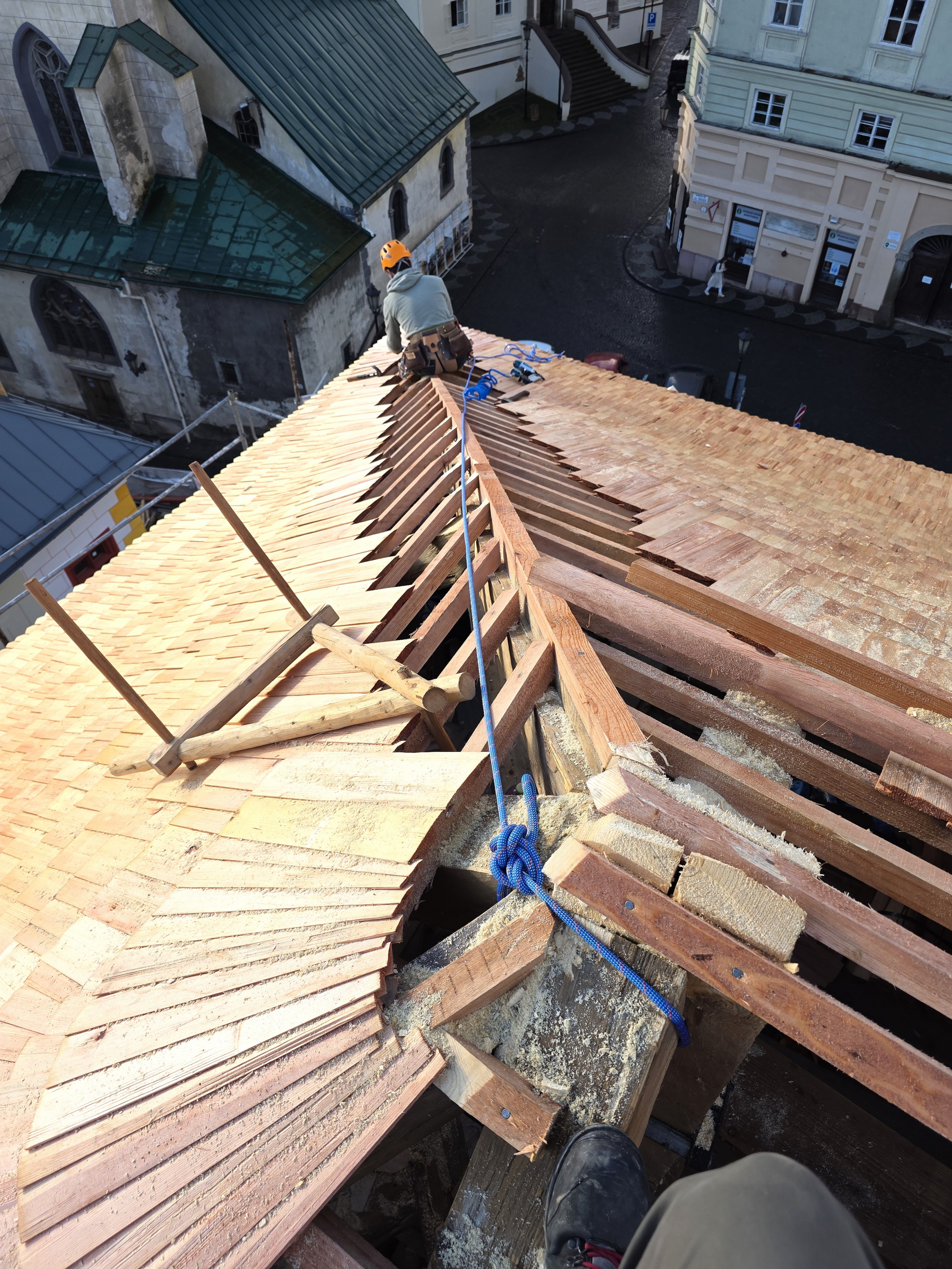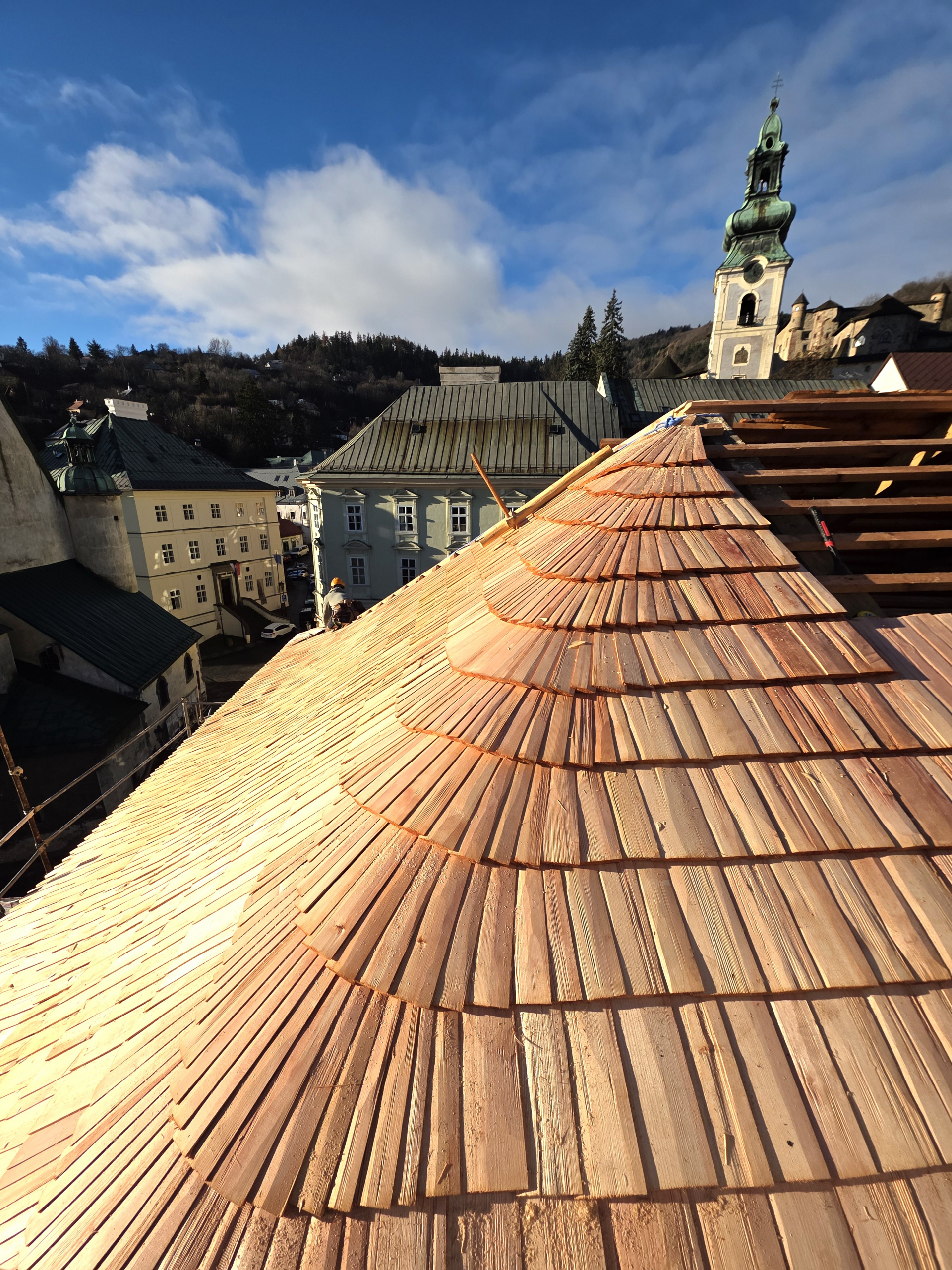 Aktuálna fotodokumentácia zachytáva dynamiku záverečných prác rekonštrukcie strechy. Pokládka štiepaného šindľa vrcholí a na povrch vystupuje precízna remeselná práca, ktorá sa bežne skrýva pod vrstvami finálneho výsledku. Vďaka fotografiám môžete aj vy nahliadnuť do živého procesu.