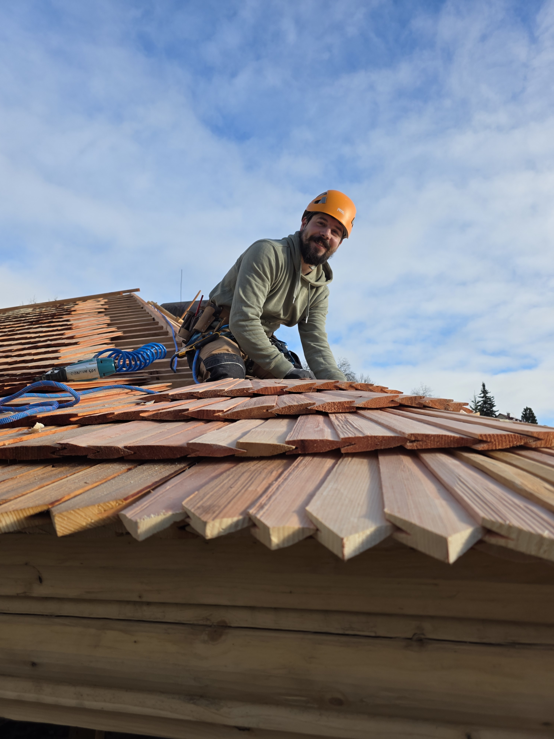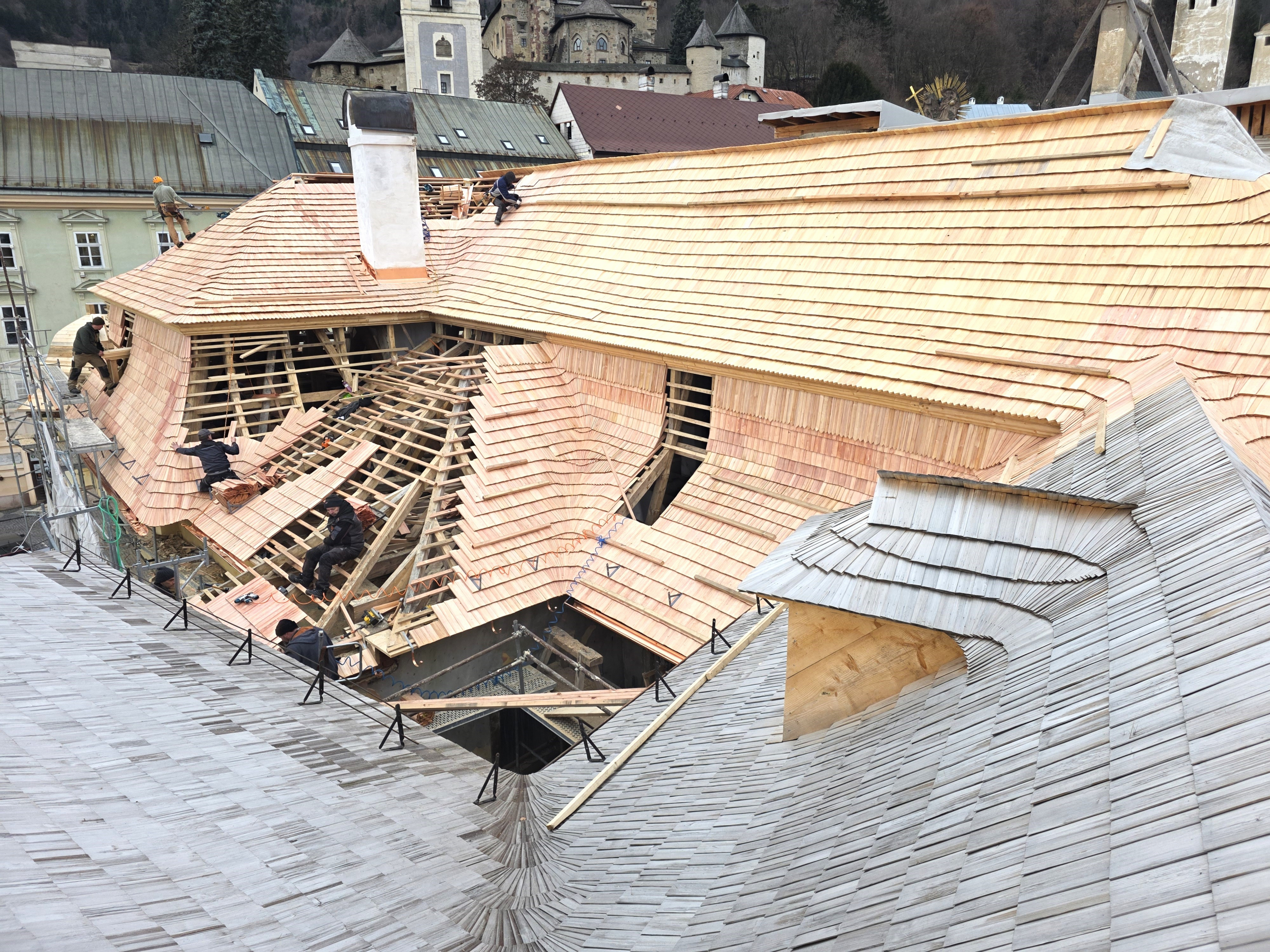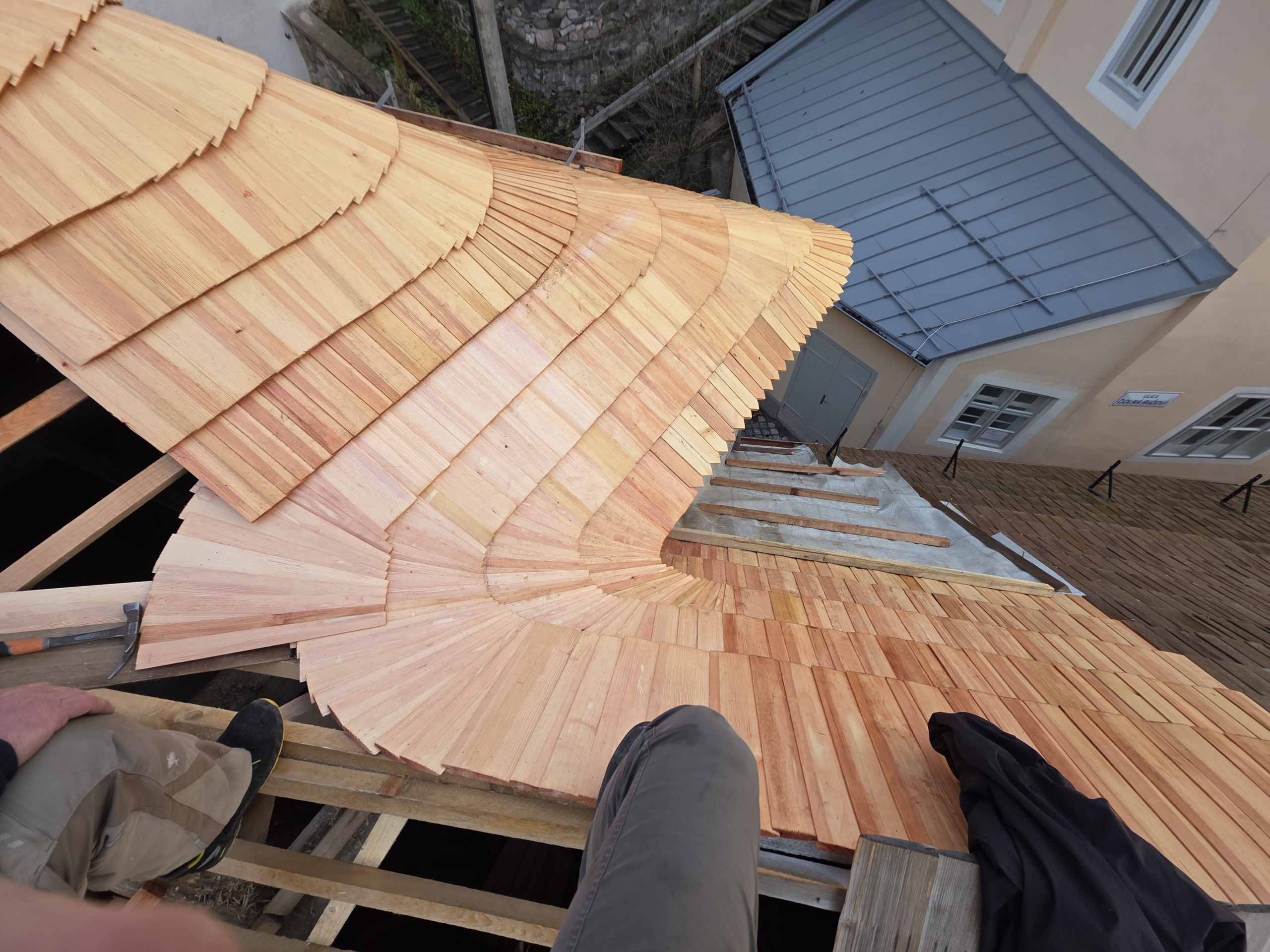 V úzkej spolupráci s projektantmi a koordinačným tímom remeselníci starostlivo cizelujú všetky rozhodujúce prvky strechy – vikiere, úžľabia, nárožia, hrebene, rímsy aj samotné riadkovanie štiepaného šindľa. Každý krok musí fungovať technicky a zároveň pôsobiť harmonicky. Práve tento súlad určuje skutočnú kvalitu obnovy historickej architektúry.