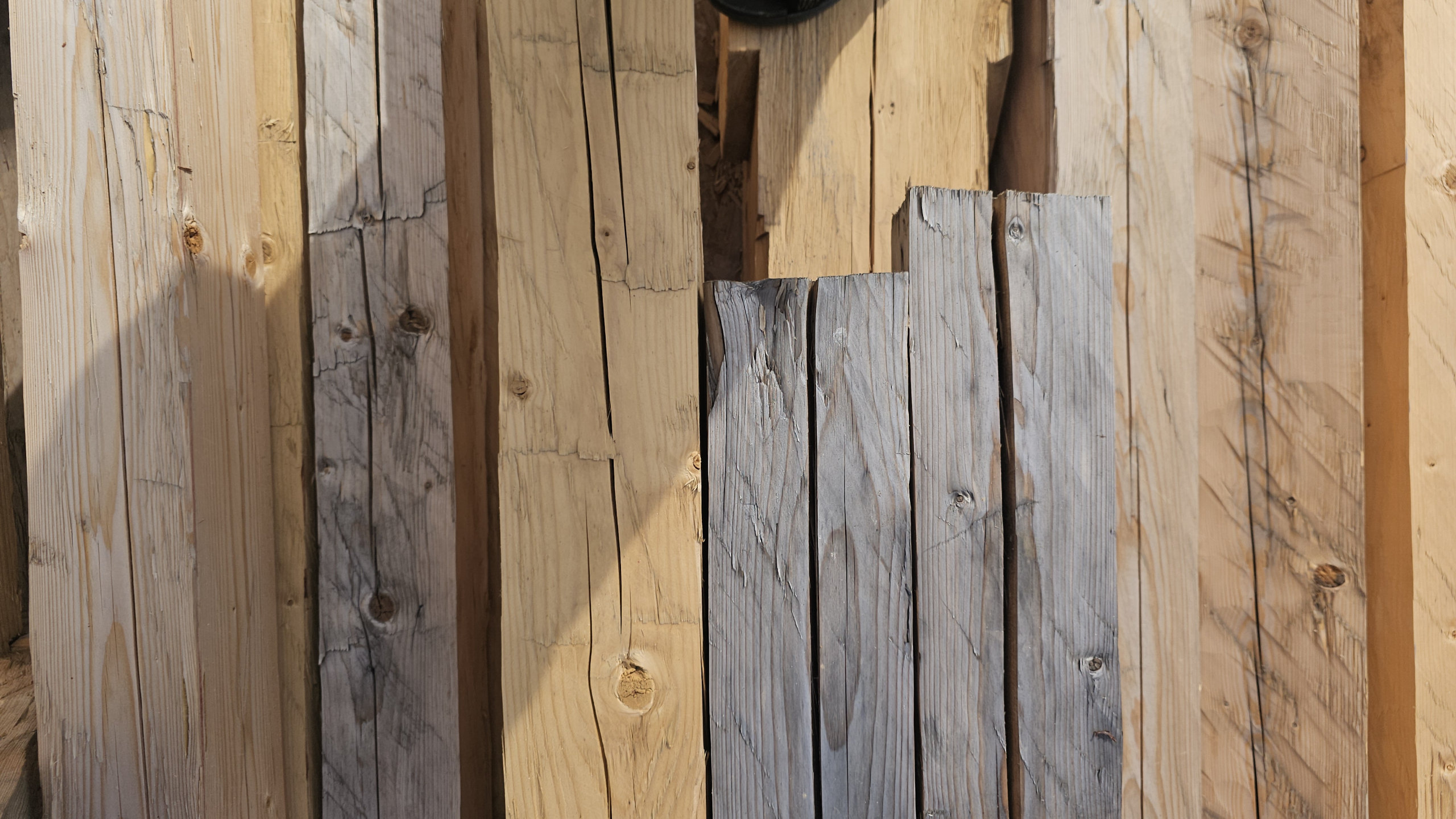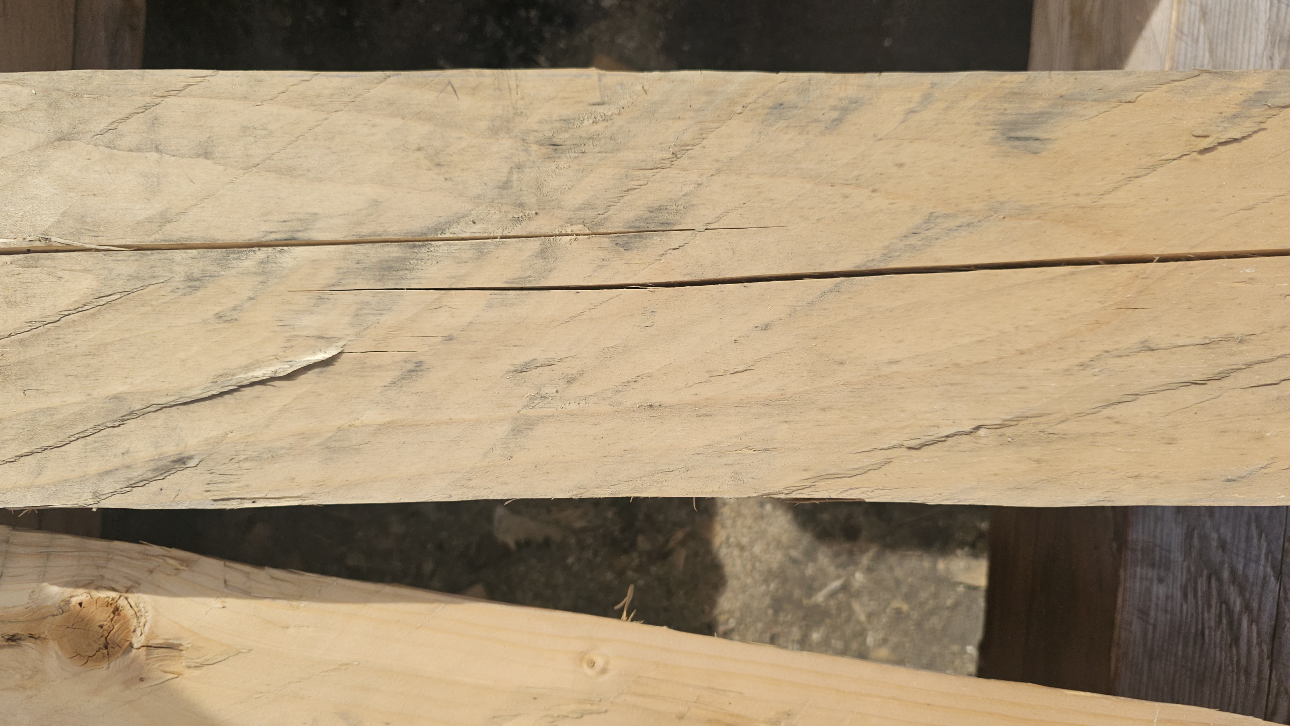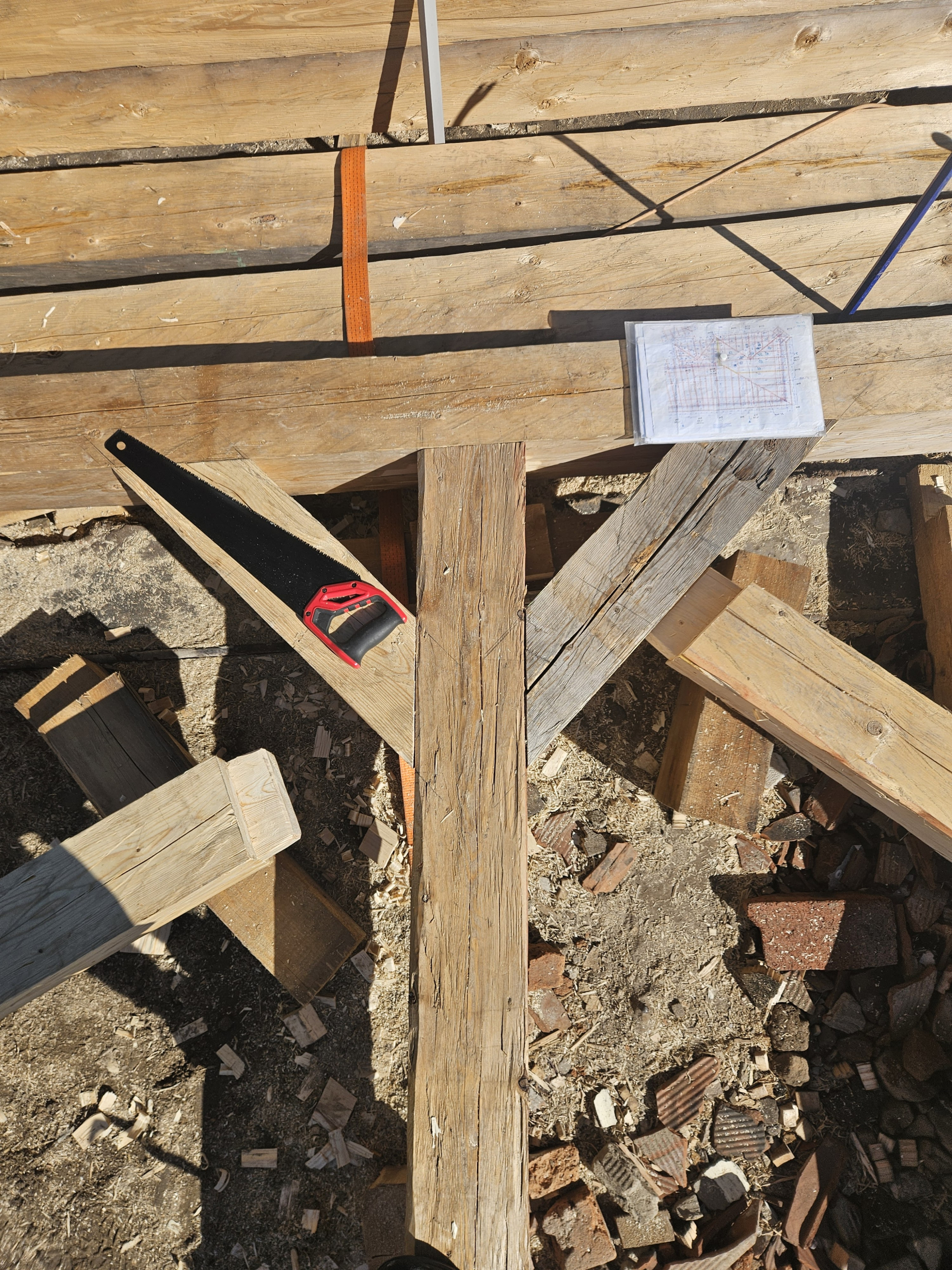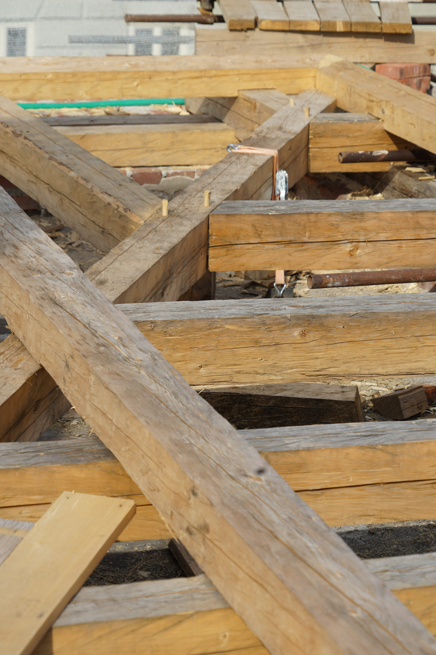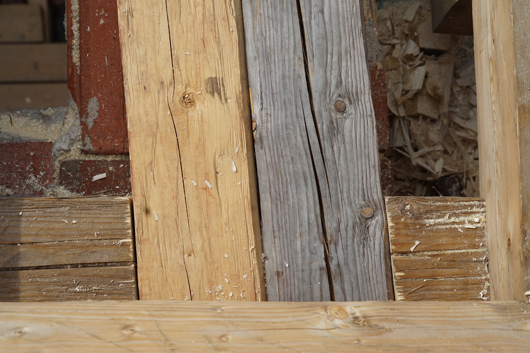 Farebné zmeny teda nie sú varovným signálom poškodenia, ale prirodzenou reakciou materiálu na prostredie. Pre nás sú zároveň vizuálne pôsobivým momentom, ktorý dokumentujeme v našej fotogalérii. A ak na snímkach uvidíte purpurové či bordové línie, nejde o ďalší pigmentačný efekt – sú to stopy po tradičných tesárskych brnkačkách, teda značkovacích šnúrach s kriedou, ktoré pomáhajú pri presnom ručnom kresaní guľatiny.