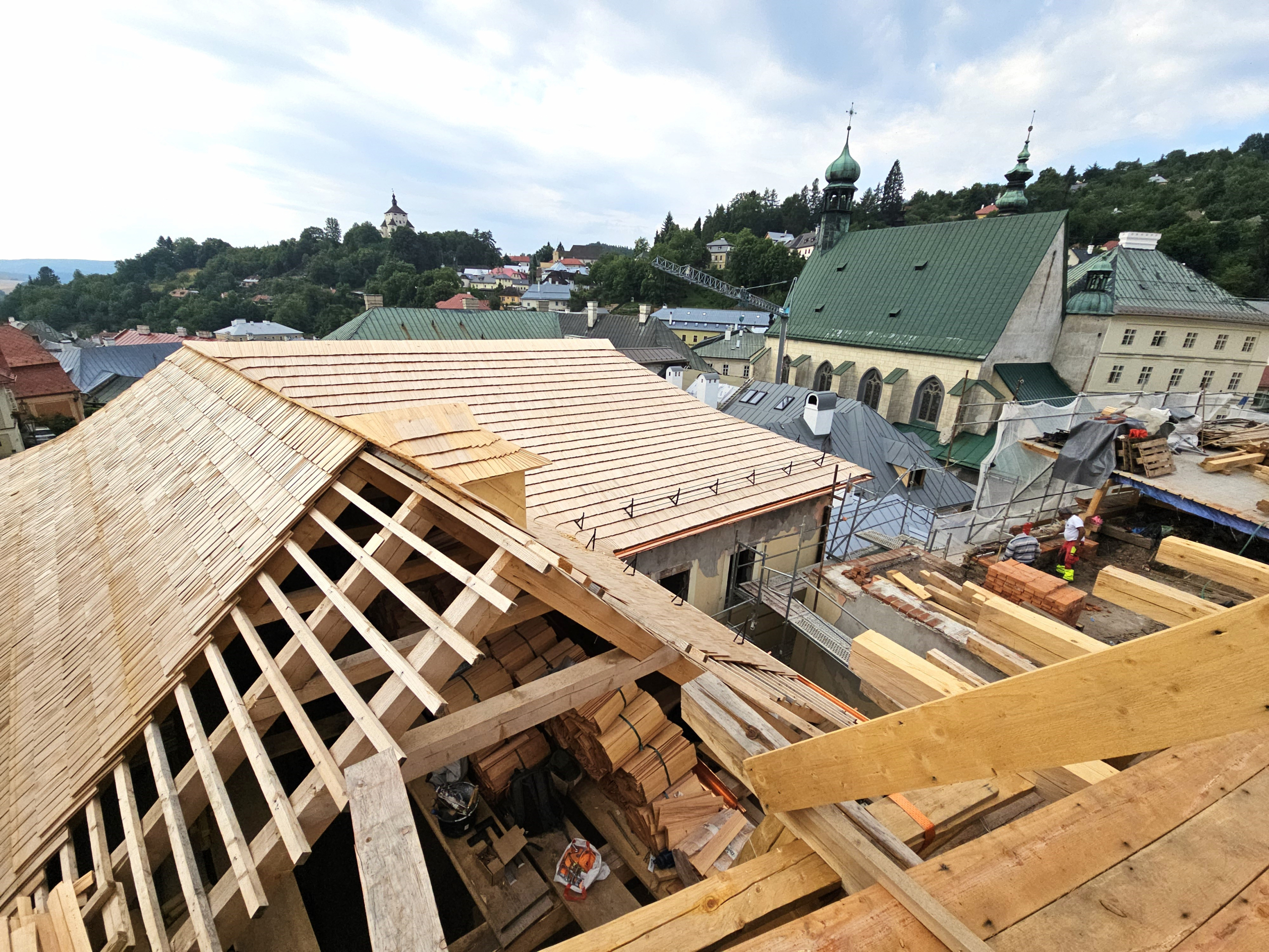 V týchto polohách sa nezachoval historický krov. Preto sa obnova valbovej strechy a konštrukcie krovu realizovala štandardnými súčasnými postupmi z pílených hranolov s modernými spojkami prvkov. Krytinu z dreveného štiepaného šindľa sme uložili v bezpečnom dvojradovom kladení.