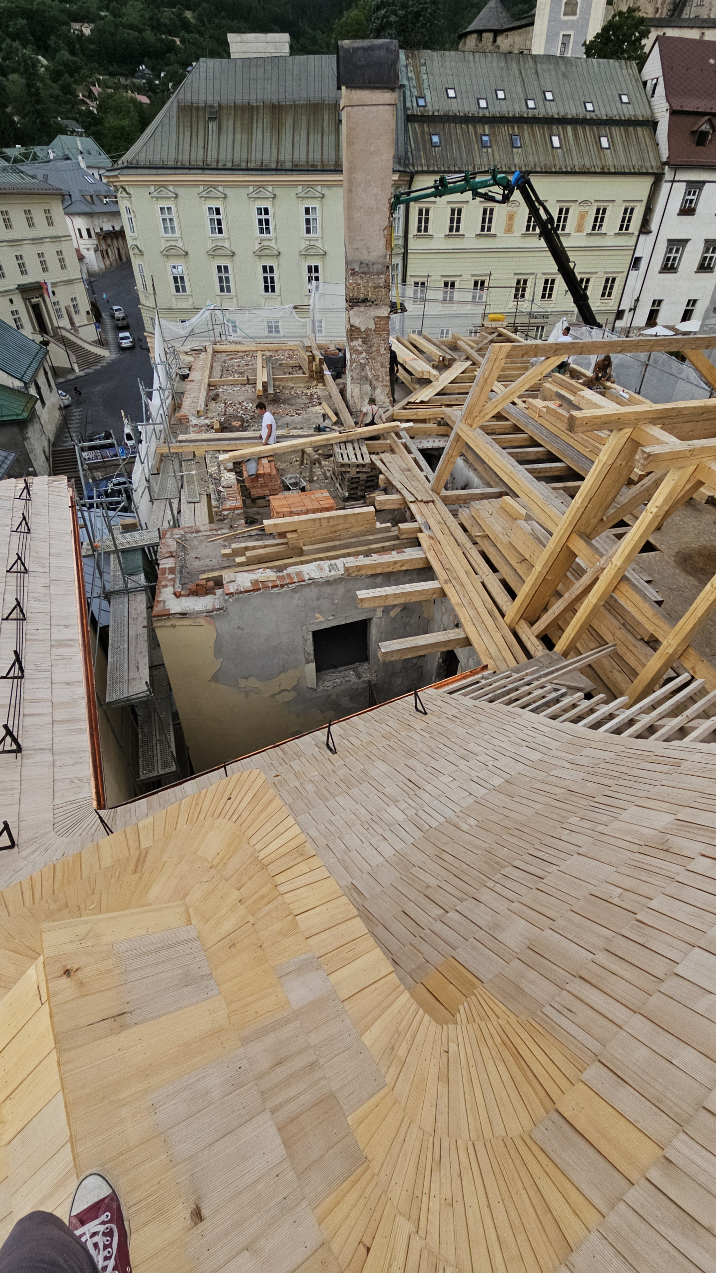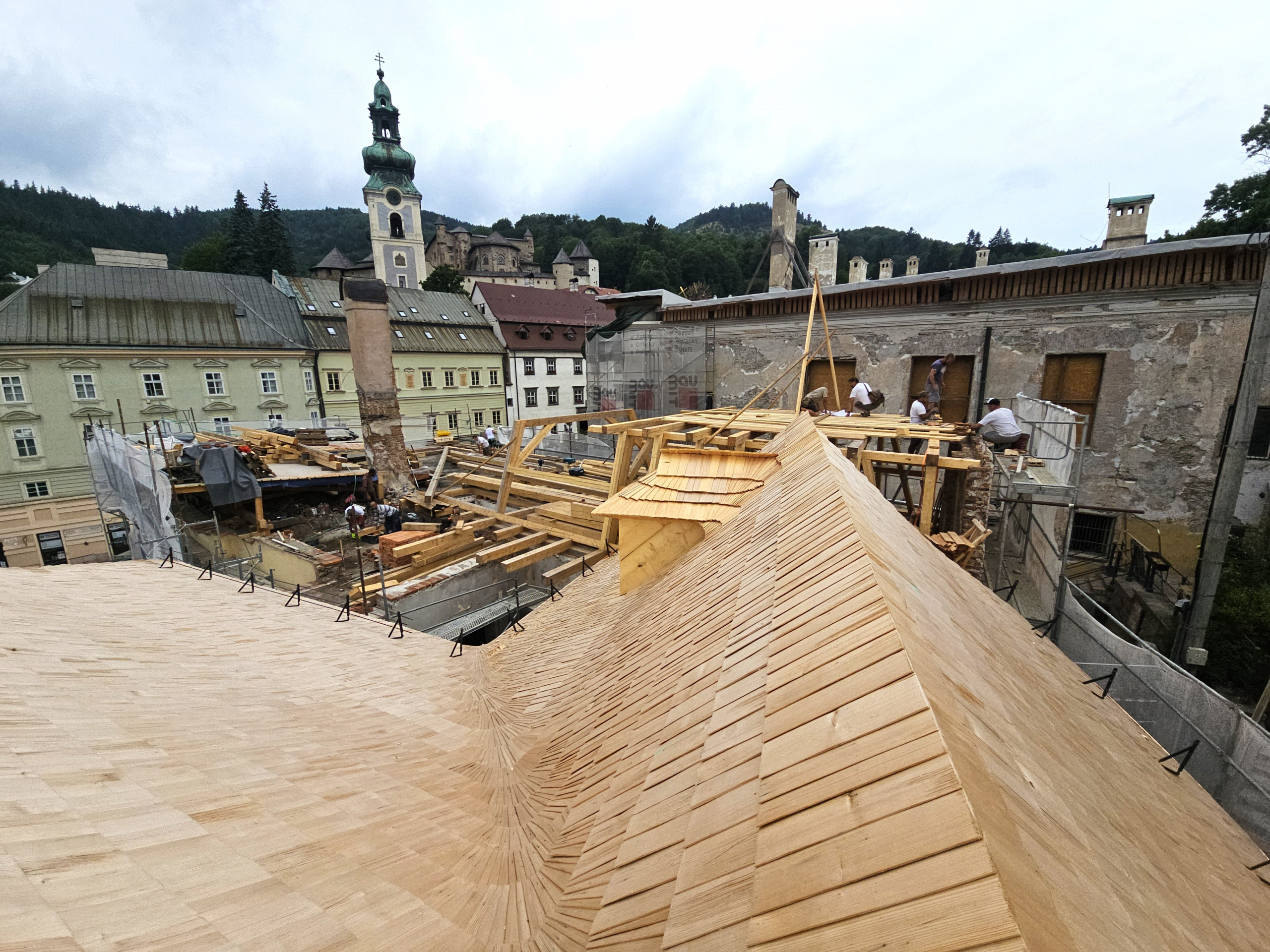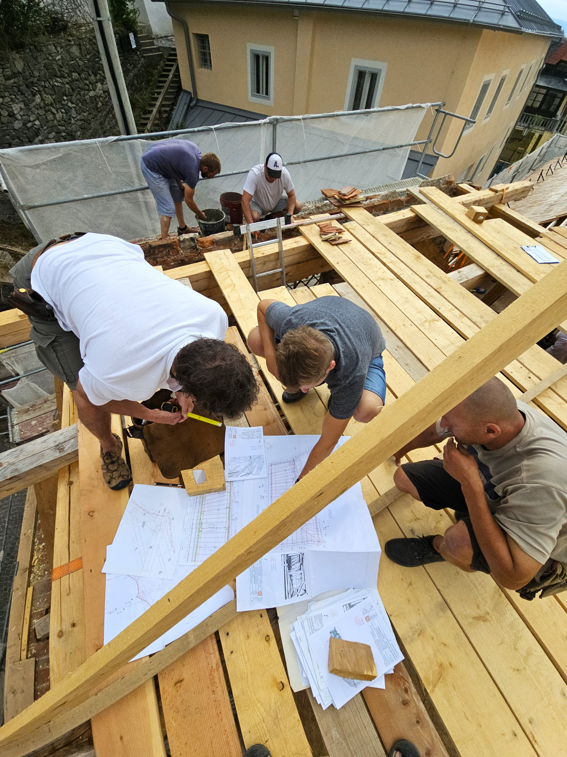 Paralelne prebieha proces dvíhania kresaného krovu manzardovej strechy nad západným a južným krídlom domu. Každodenné porady tímu, v epicentre ktorých je projektová dokumentácia, plánovanie a koordinácia ďalšieho postupu, sú už nevyhnutnou zaužívanou rutinou.