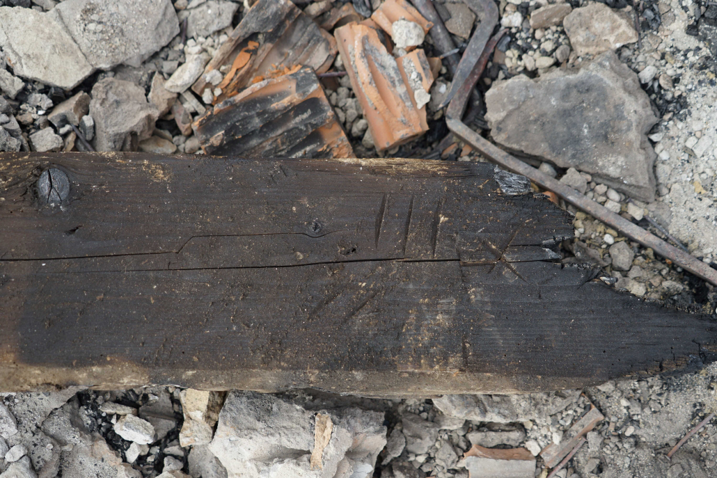 - Obhorený zvyšok barokovej krokvy s čitateľným tesárskym číslovaním.