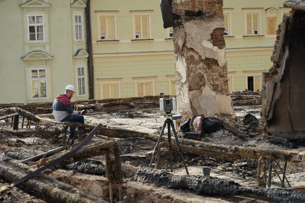 Fotografie dokumentujú momenty, kedy sa na „zhorenisku“ stretli architekti, pamiatkari, statici a geodeti. Atmosféra bola poznačená nielen rozsahom škôd, ale aj technickou náročnosťou stabilizácie objektov. V ruinách Szitnyayovského domu sme vtedy medzi zvyškami sute identifikovali kľúčové fragmenty: